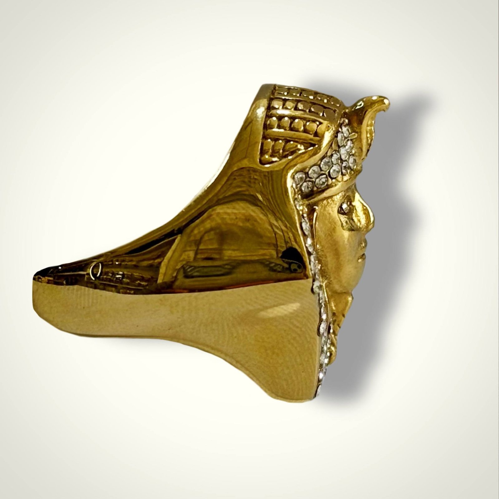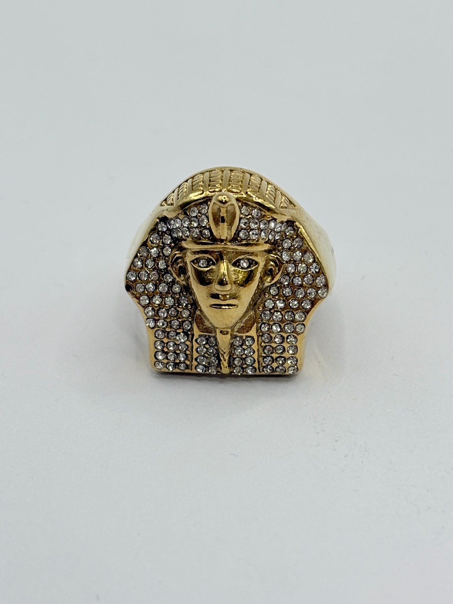 Anillo masculino en acero inoxidable dorado con diseño de cabeza de faraón y detalles de circonitas. Disponible en tallas 19, 20, 21, 22 y 23. Una pieza imponente que refleja poder y sofisticación.