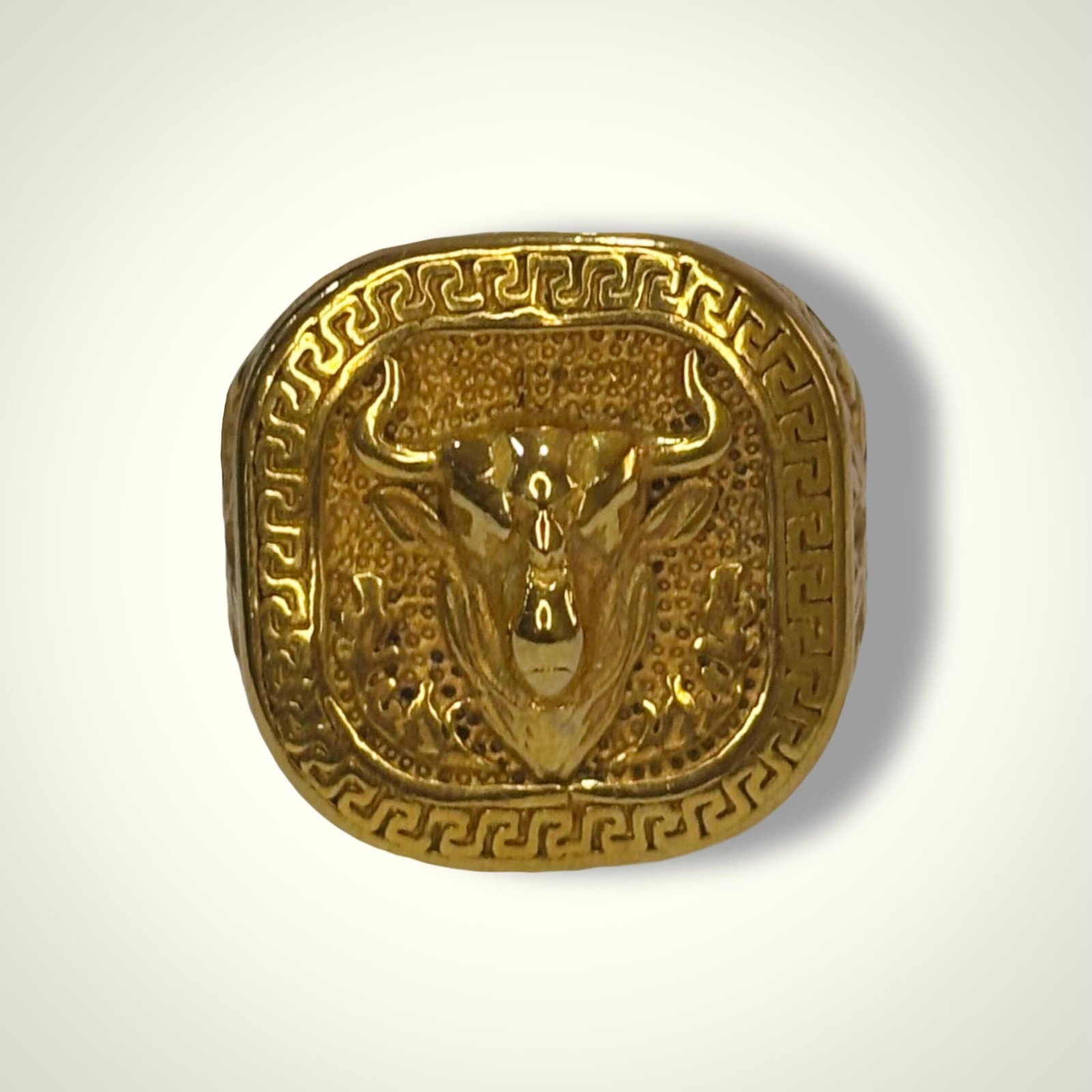 Anillo de estilo imponente y carácter clásico, protagonizado por una cabeza de toro en relieve como motivo central. El frontal presenta un diseño cuadrado con bordes suavizados, enmarcado por un grabado tipo greca que aporta un aire ornamental y robusto. El fondo ligeramente punteado realza el volumen del toro, símbolo de fuerza y determinación.