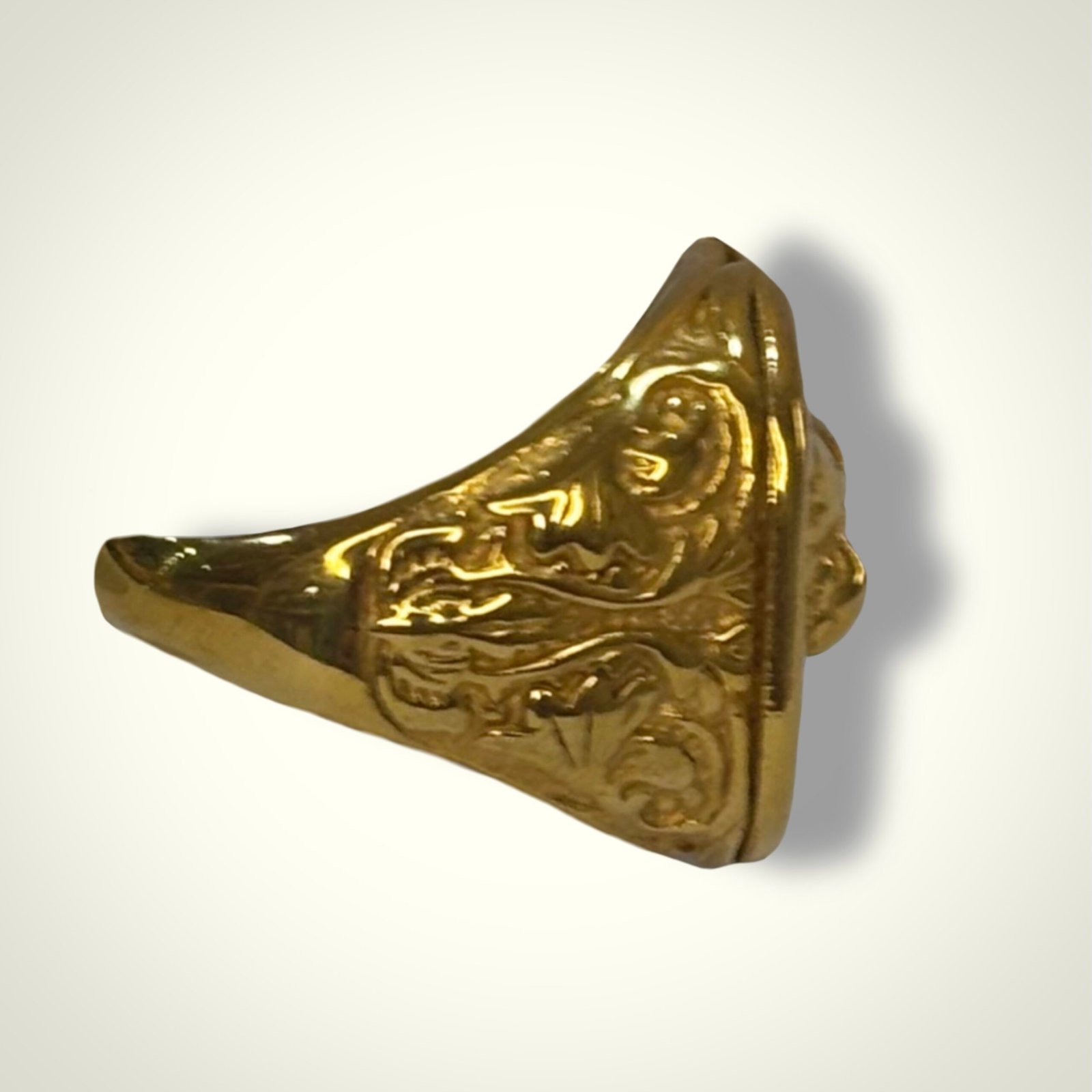 Los laterales del anillo están ricamente trabajados con relieves y formas orgánicas, aportando profundidad y continuidad al diseño, mientras que el acabado completamente dorado le da un aspecto sólido y elegante. Un anillo con presencia, pensado para quienes buscan una pieza llamativa, con inspiración clásica y un marcado estilo masculino.