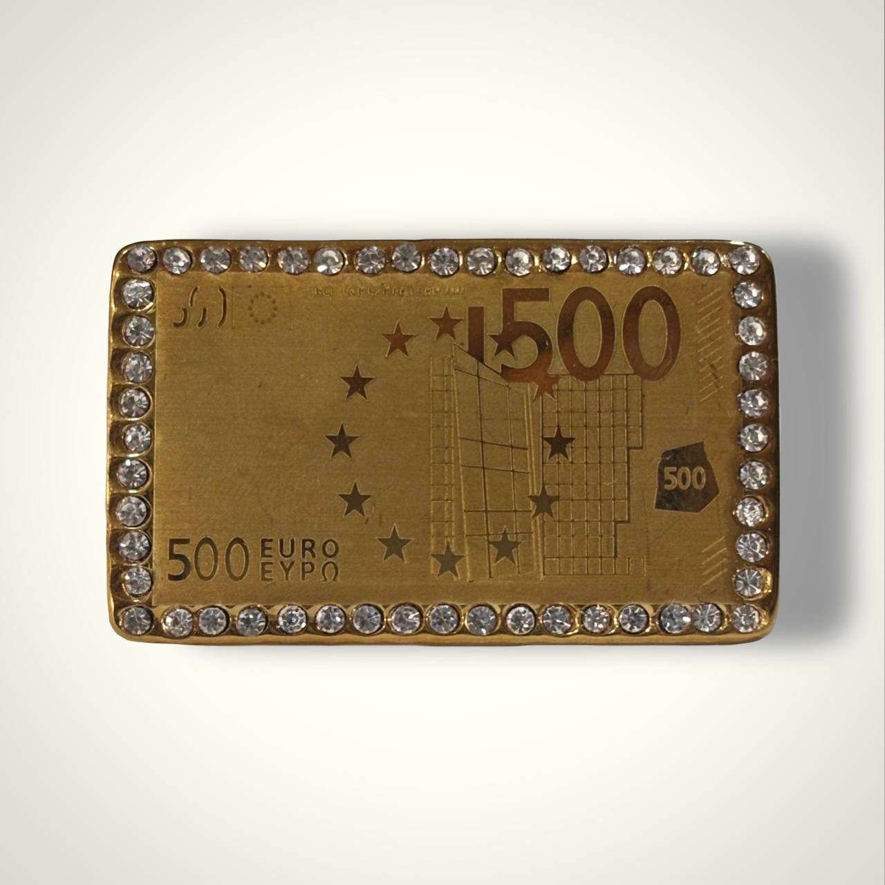 Anillo doble dedo en acero inoxidable con diseño del billete de 500 euros decorado con circonitas. Disponible en tallas 18, 19, 20, 21 y 22. Una pieza extravagante y brillante que refleja lujo y personalidad.