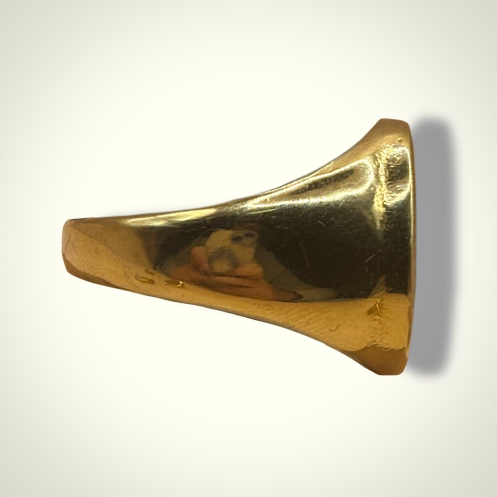 Anillo Mercedes redondo en acabado dorado, con frente circular que presenta el emblema de la estrella de tres puntas en relieve sobre fondo texturizado y marco con motivo de greca. Los laterales lisos aportan un contraste elegante y refuerzan su diseño sólido y equilibrado. Una pieza de estética clásica, con fuerte presencia y carácter atemporal.
