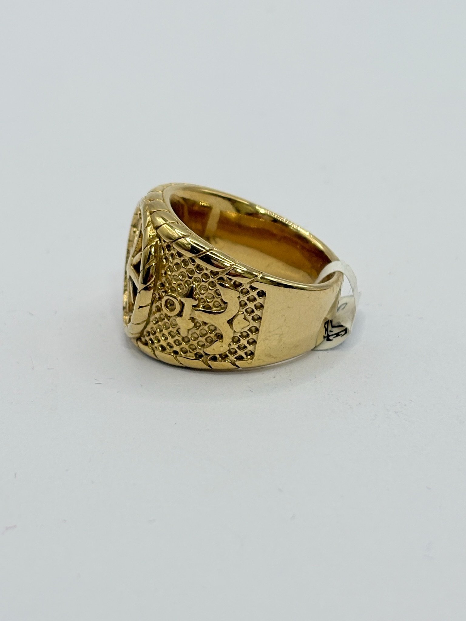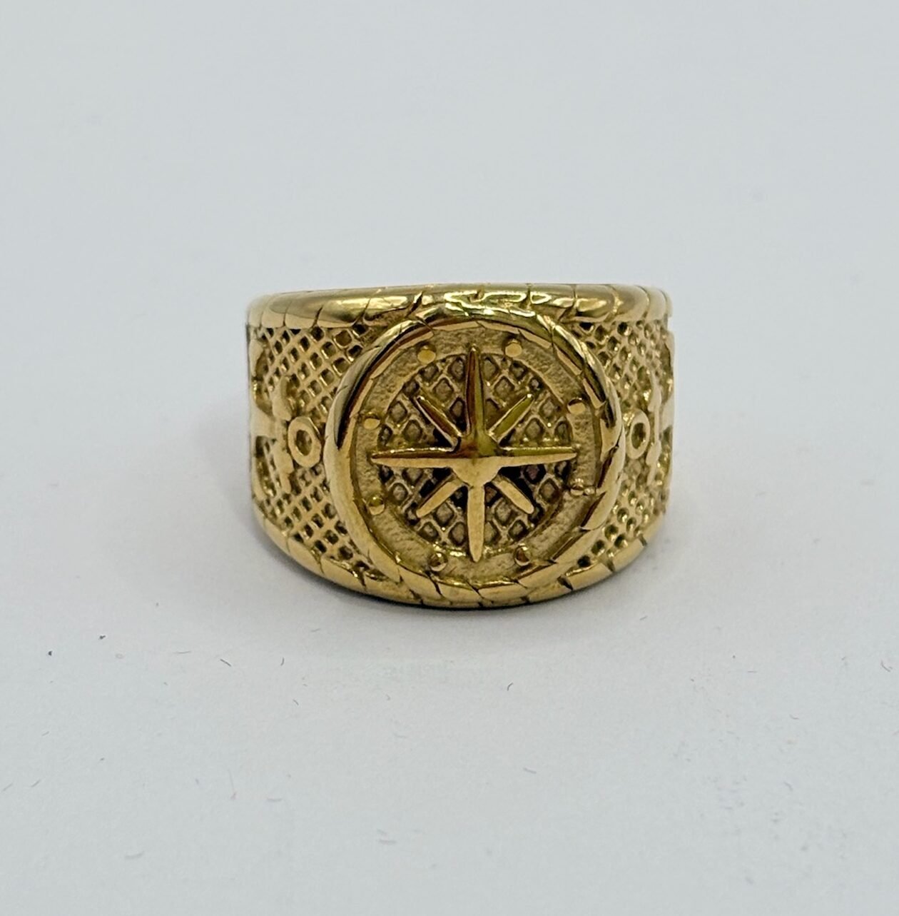 Anillo con diseño de brújula en relieve y acabado exclusivamente en dorado. El frontal circular presenta la rosa de los vientos con los puntos cardinales grabados, símbolo de guía y orientación. El aro incorpora detalles laterales de inspiración náutica, incluyendo un grabado de ancla, que refuerzan su carácter marinero y clásico. Una pieza sólida y atemporal, pensada para quienes buscan un anillo con significado, estilo y personalidad.