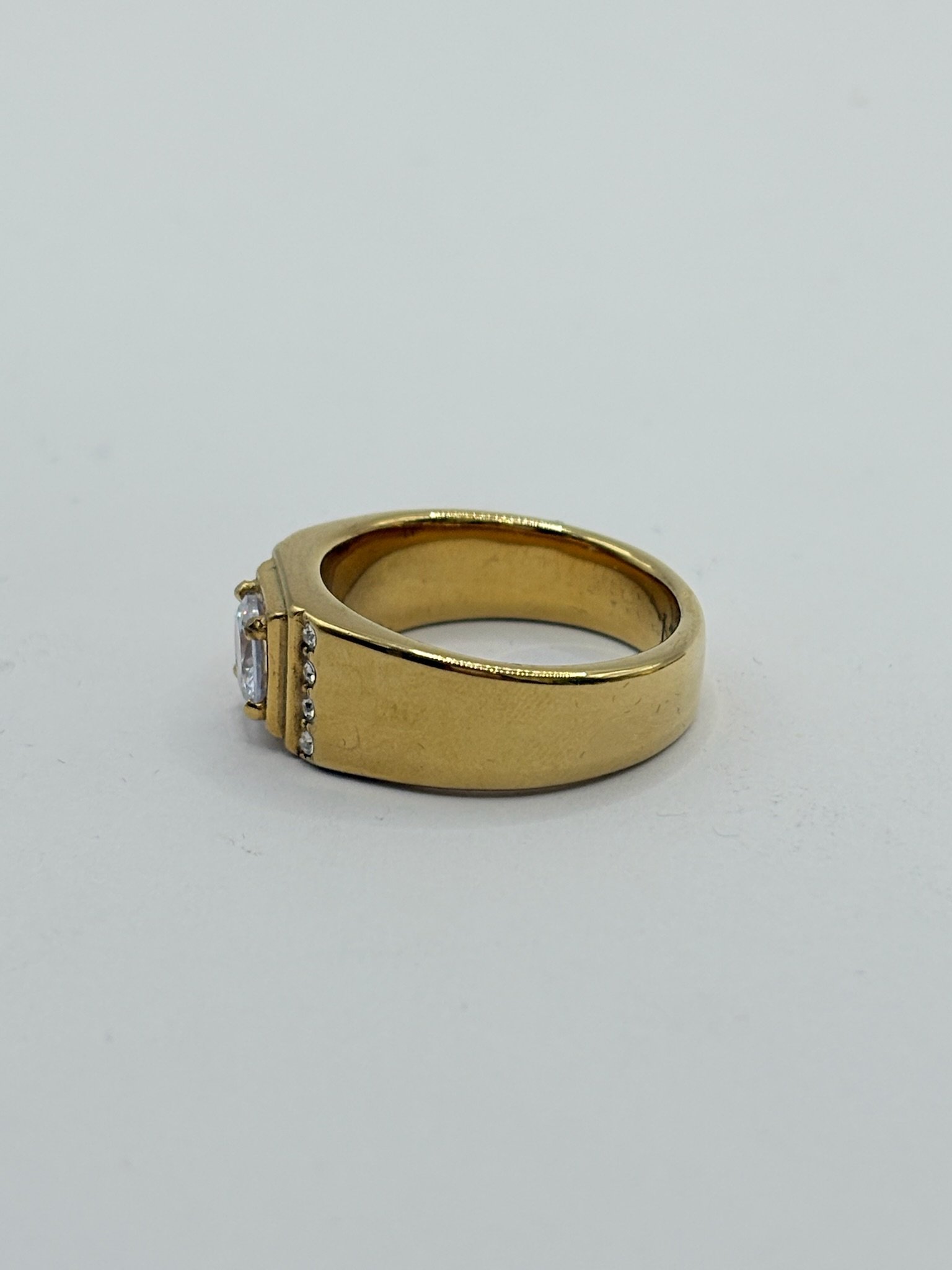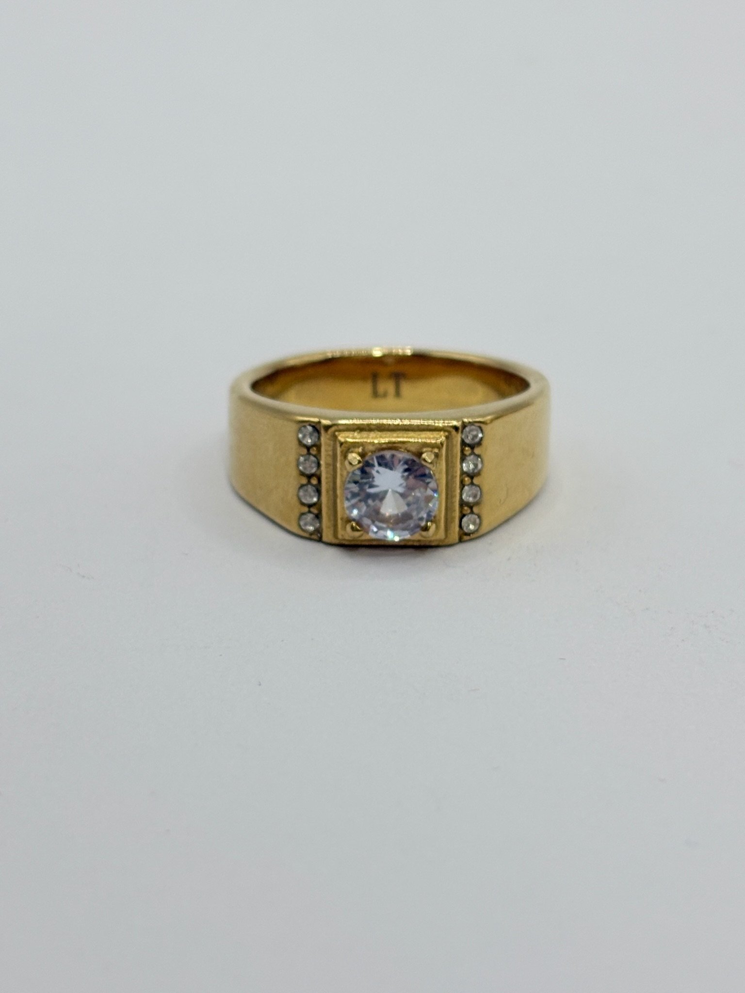 Anillo masculino en acero inoxidable dorado con una piedra central de gran tamaño en color blanco y pequeñas piedras en los laterales. Una pieza elegante y delicada, ideal para quienes buscan un estilo sutil con un toque distintivo. Disponible en acabado dorado y plateado.
