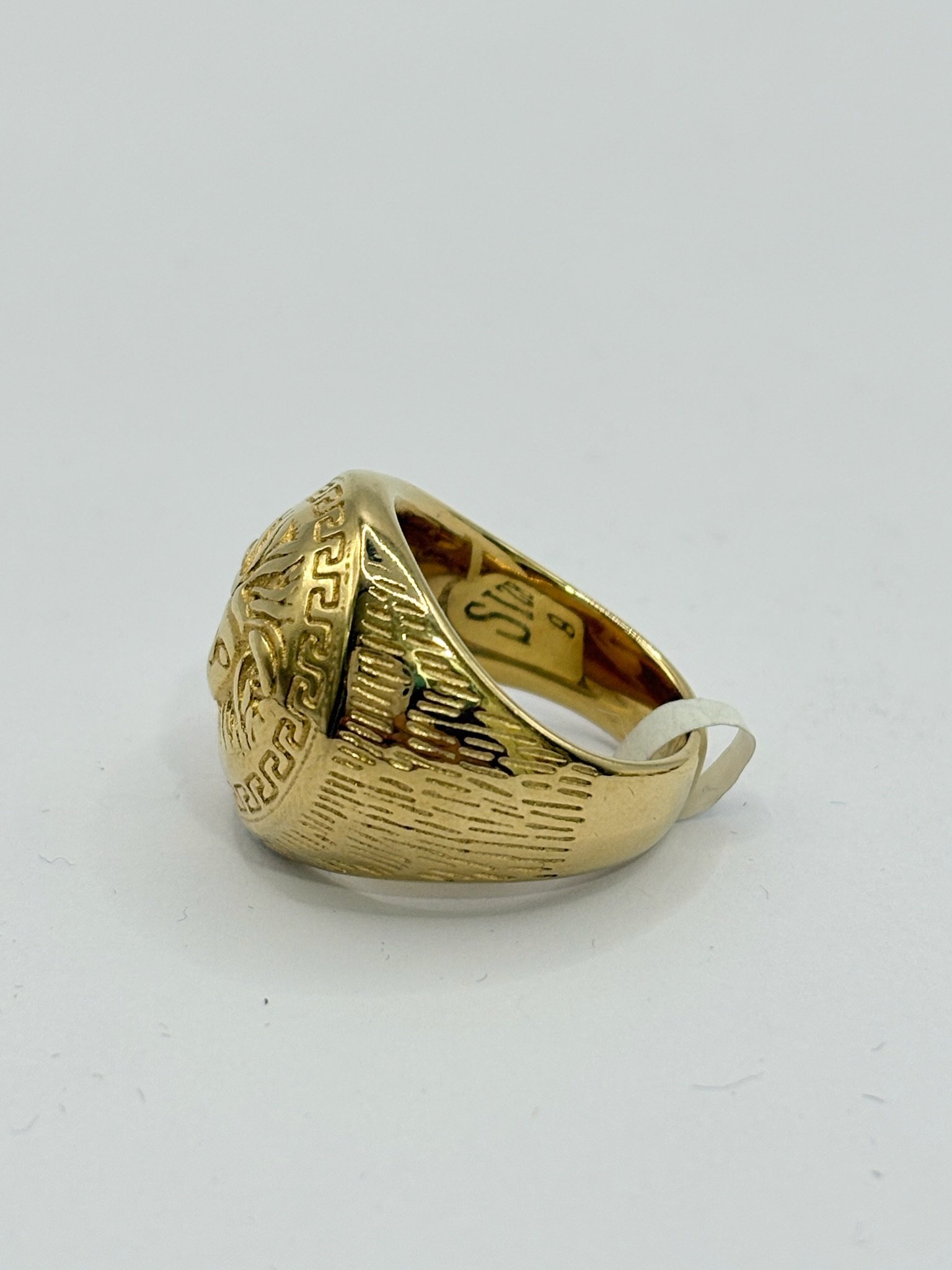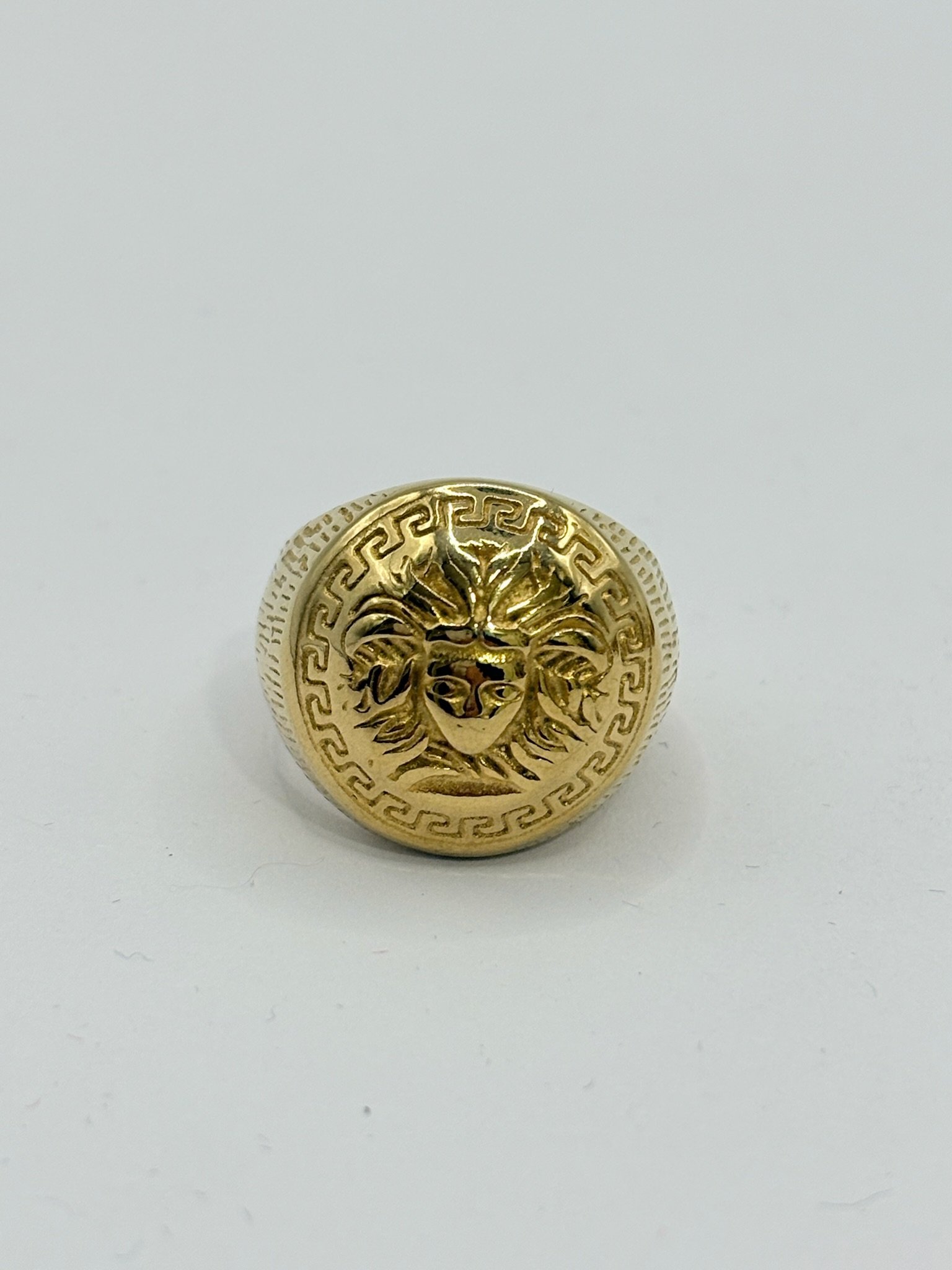 Aureum Sovereign es un anillo de carácter imperial, elaborado en acabado dorado y protagonizado por un relieve central de inspiración clásica. La emblemática greca grabada rodea la figura principal, reforzando su estética de poder y herencia antigua. Su volumen sólido y líneas definidas convierten esta pieza en un símbolo de autoridad, lujo y presencia atemporal, ideal para quienes buscan un diseño dominante y elegante.