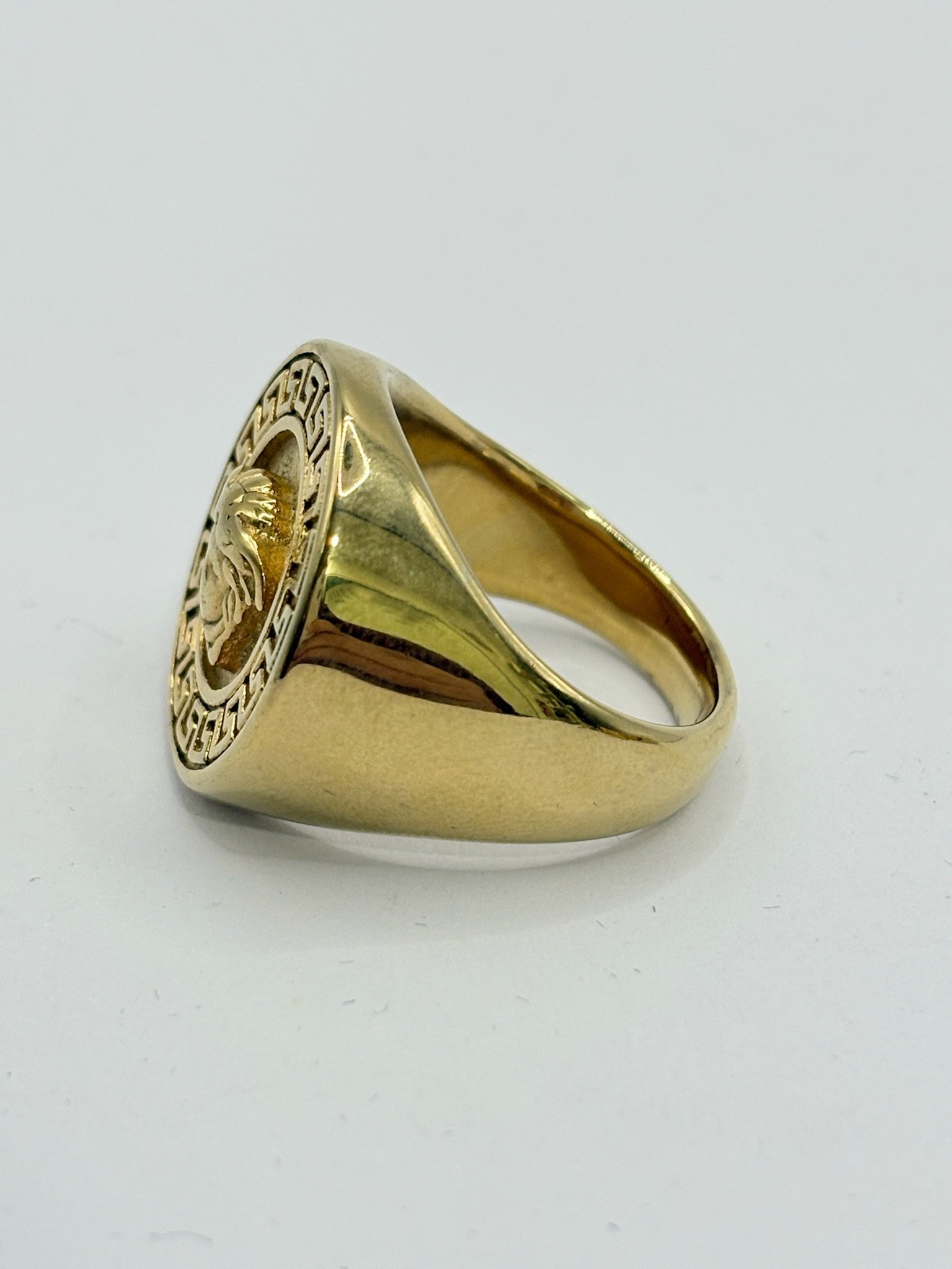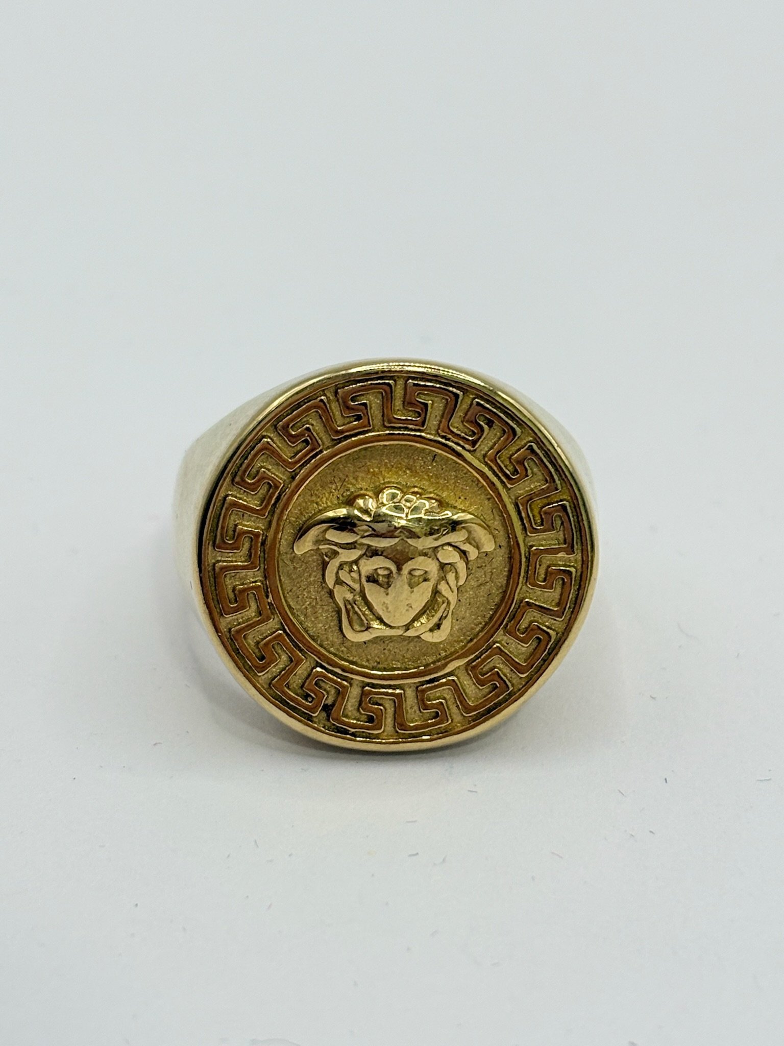 Anillo dorado de presencia imponente, protagonizado por el rostro de Medusa en relieve y enmarcado por la greca clásica. Su cuerpo macizo y pulido refuerza una estética de poder y autoridad, mientras que los detalles laterales aportan profundidad y carácter. Praetor Dominus es una pieza de inspiración clásica, pensada para quienes buscan un símbolo de dominio, elegancia y fuerza atemporal.