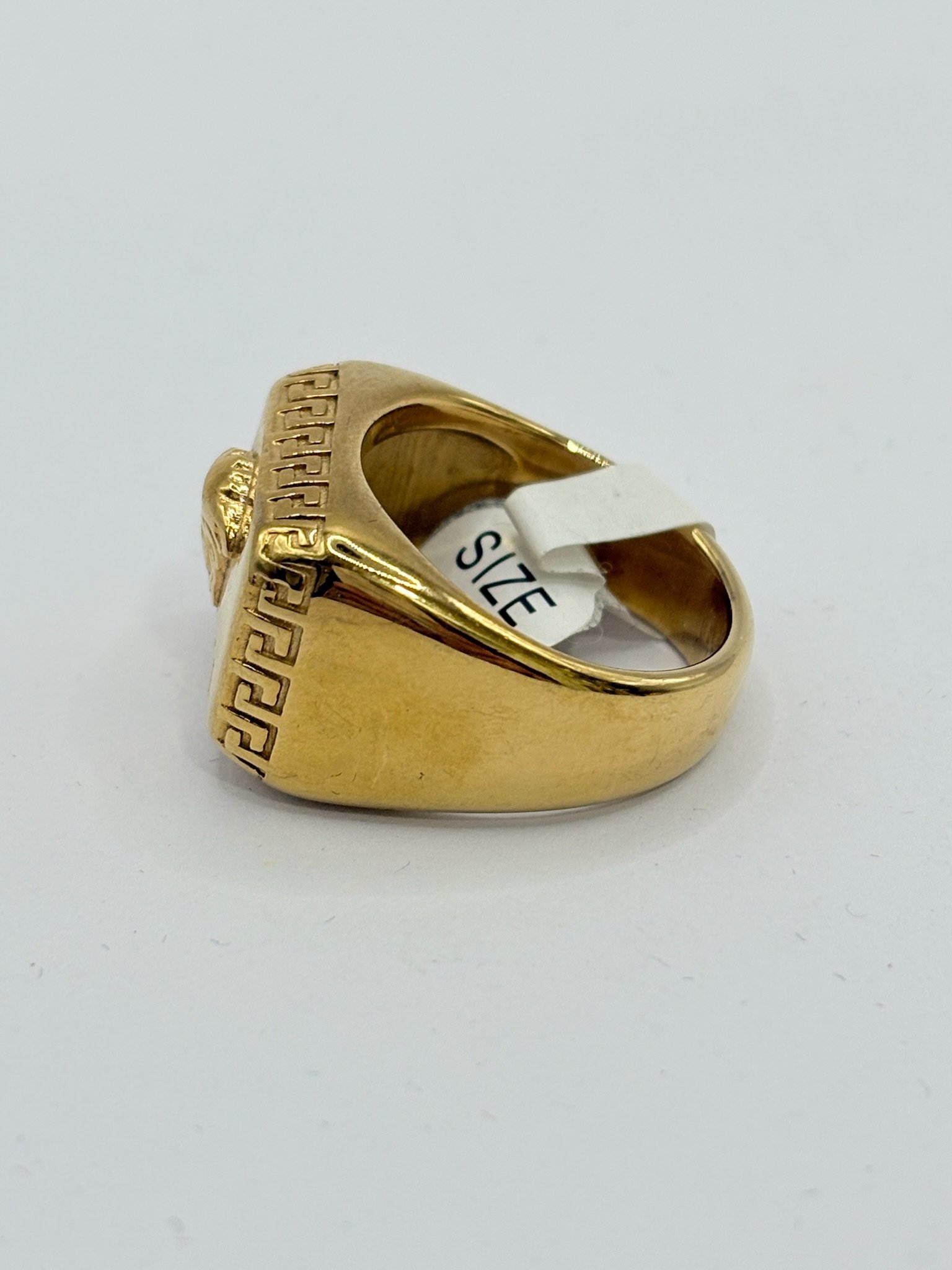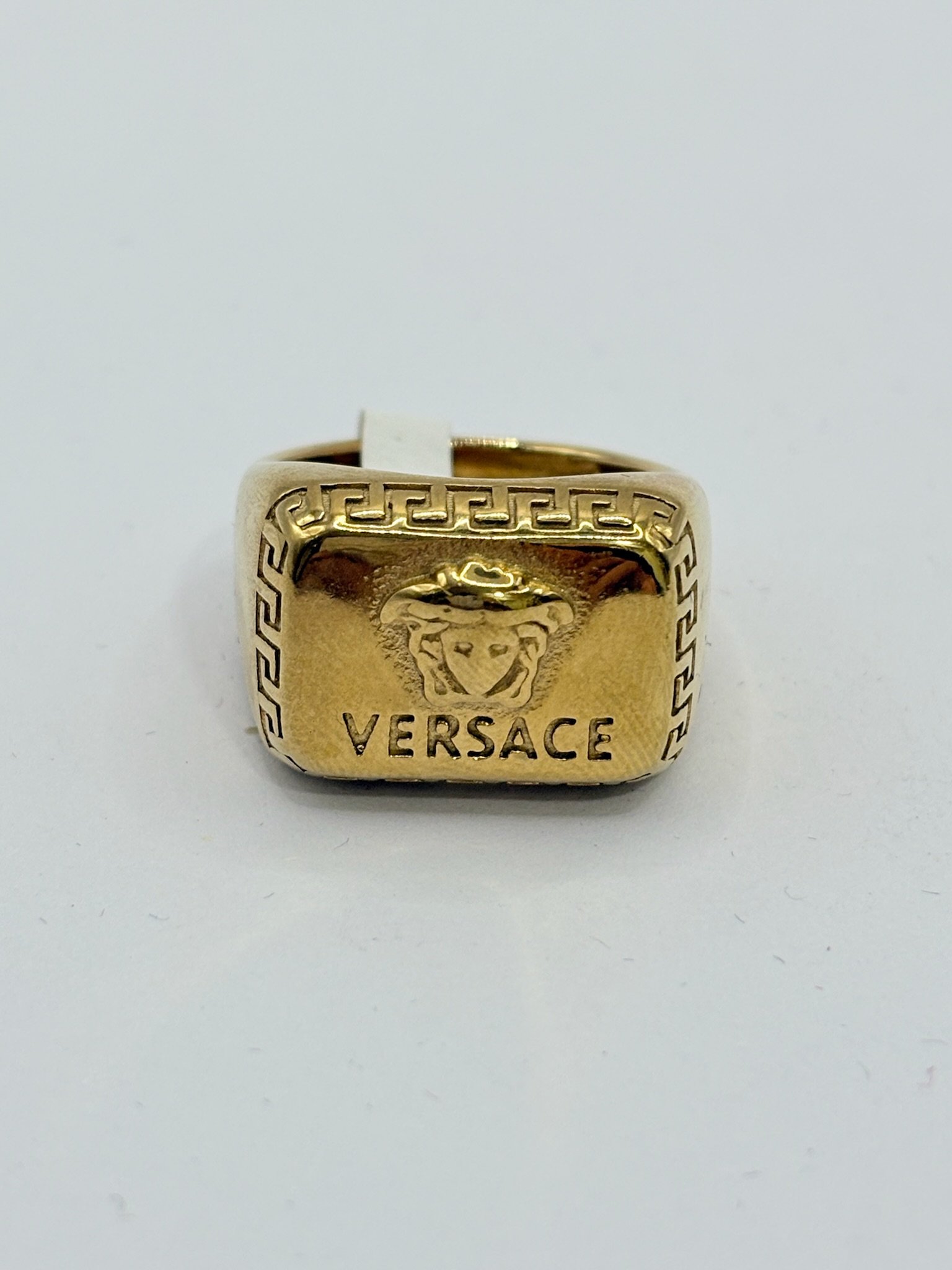 Anillo Versa estilo clásico y con frente rectangular en acabado dorado, protagonizado por la icónica cabeza de Medusa en relieve. El diseño se enmarca con la greca griega característica, presente tanto en el bisel frontal como en los laterales, aportando identidad y fuerza visual. Una pieza sólida y elegante, pensada para quienes buscan un anillo distintivo, atemporal y con carácter de lujo.