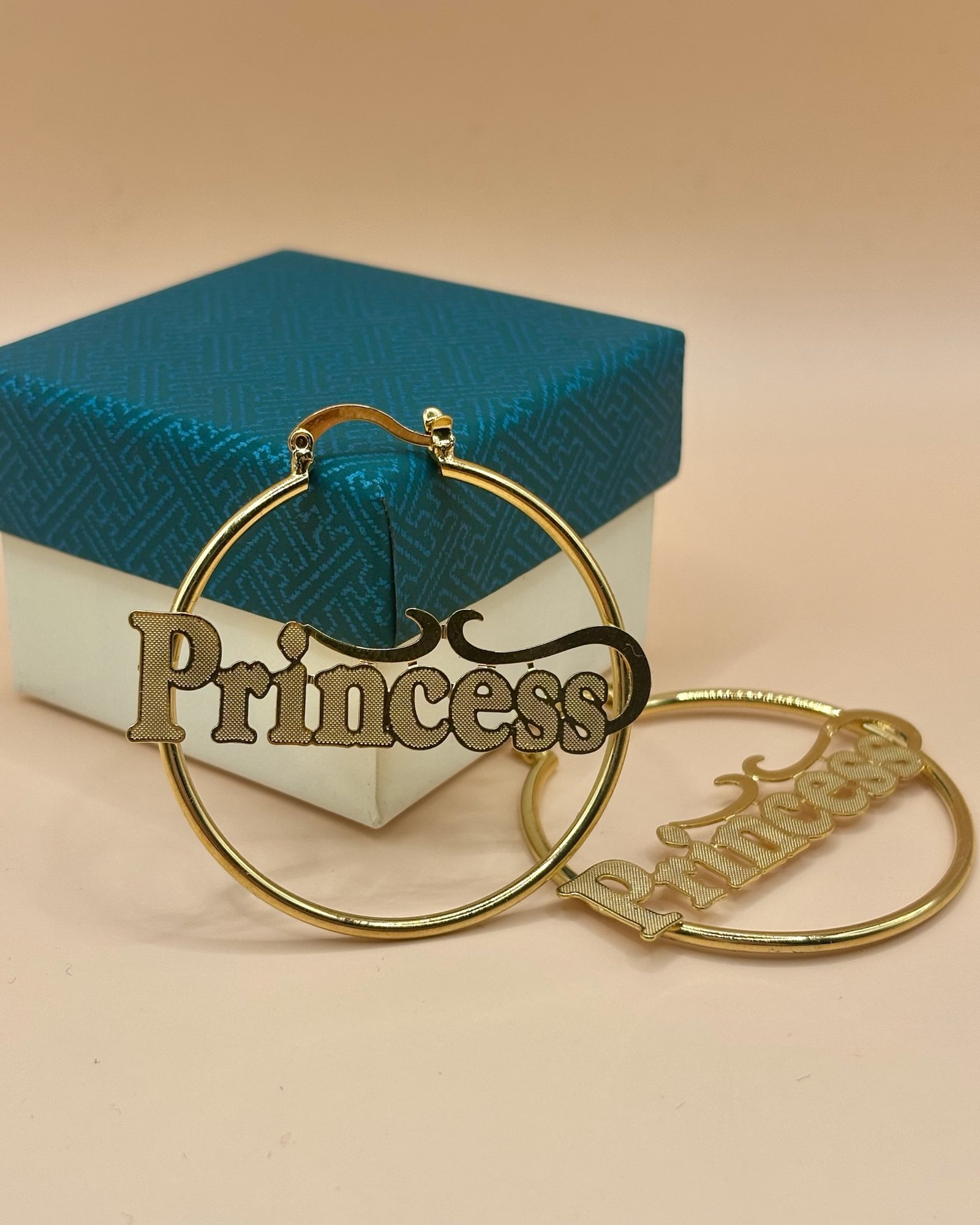 Argollas doradas de diseño moderno y carácter afirmativo, protagonizadas por la palabra “Princess” integrada en el centro del aro. Su acabado pulido aporta un brillo elegante, mientras que la tipografía marcada añade un toque audaz y femenino.
