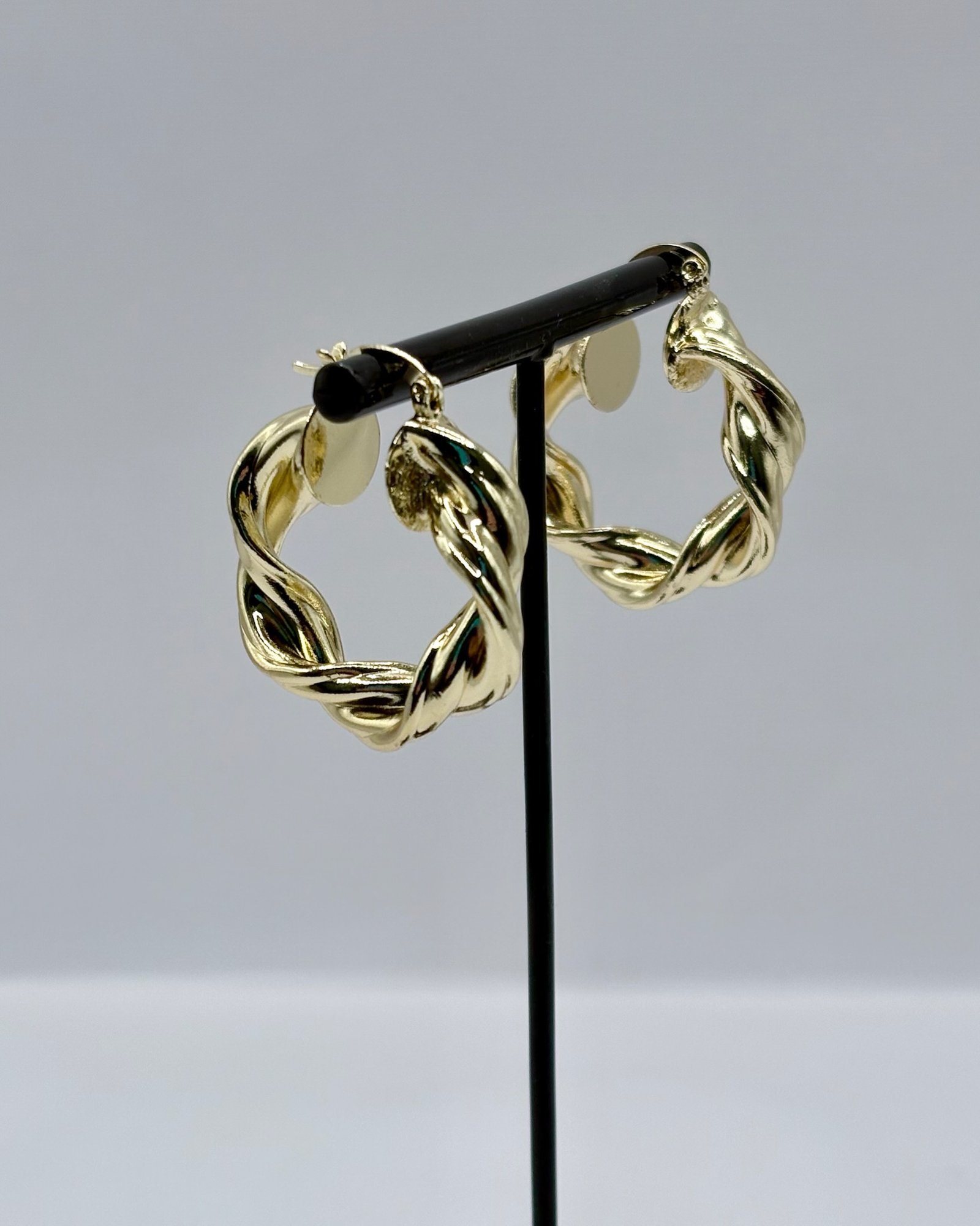 Estas elegantes argollas presentan un diseño rizado que le da un toque sofisticado y moderno. El acabado dorado brillante resalta el patrón de trenza, creando un efecto de movimiento en la pieza. Su estilo clásico y a la vez contemporáneo las convierte en el accesorio perfecto para cualquier ocasión, agregando un toque de distinción y elegancia a tu look.