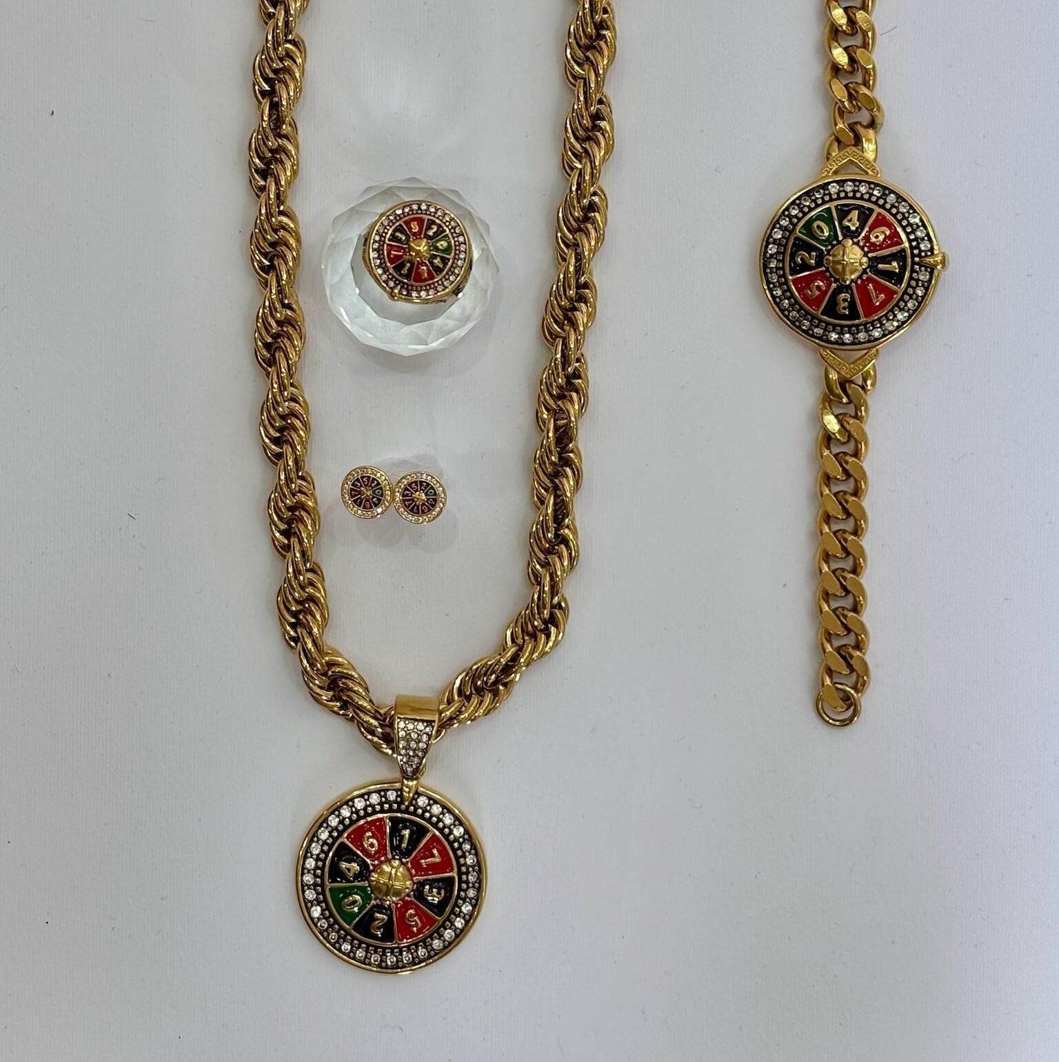 Conjunto Ruleta Brillo en acero inoxidable, compuesto por cordón, medalla, pendientes, pulsera y anillo a juego. Disponible para comprar completo o por separado. Un diseño brillante y moderno que destaca por su originalidad.