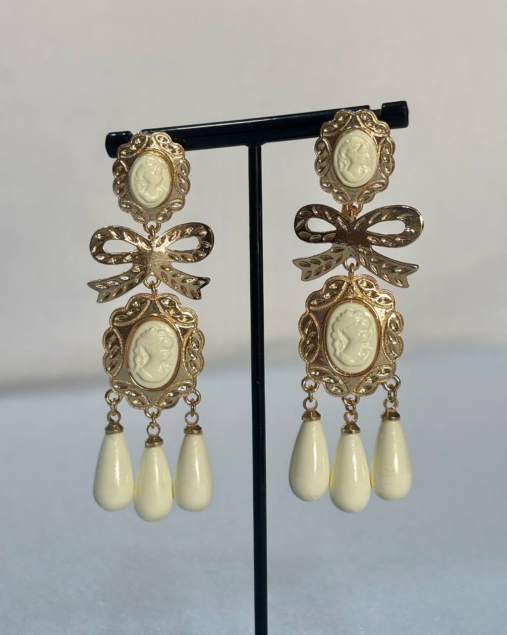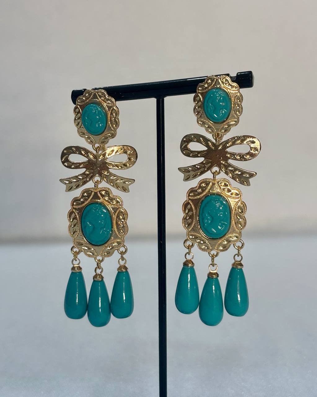 Pendientes grandes de coral con lazo y tres lágrimas colgantes. Un diseño vistoso y sofisticado que combina color, brillo y movimiento con un toque femenino.
