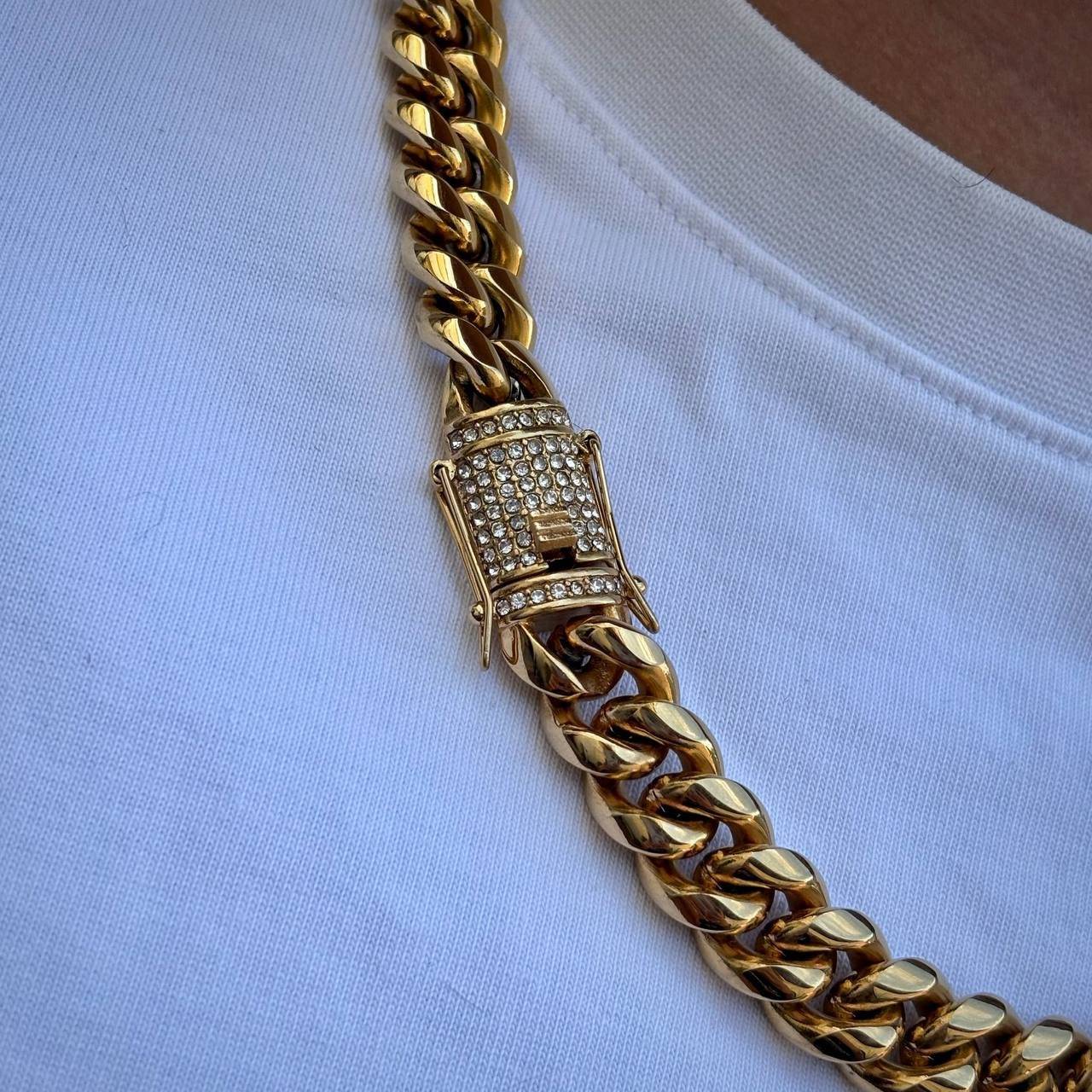 Cadena cubana en acero inoxidable con cierre de brillo de seguridad y grosor de 14 mm. Una pieza imponente y lujosa que destaca por su acabado brillante y su diseño de alta calidad.