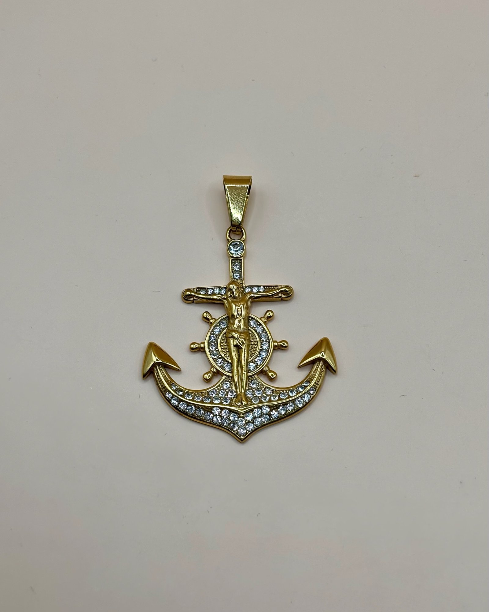 Colgante dorado con ancla y crucifijo, decorado con brillantes que aportan un acabado elegante y llamativo. Combina simbolismo religioso y marinero en una pieza única y detallada.