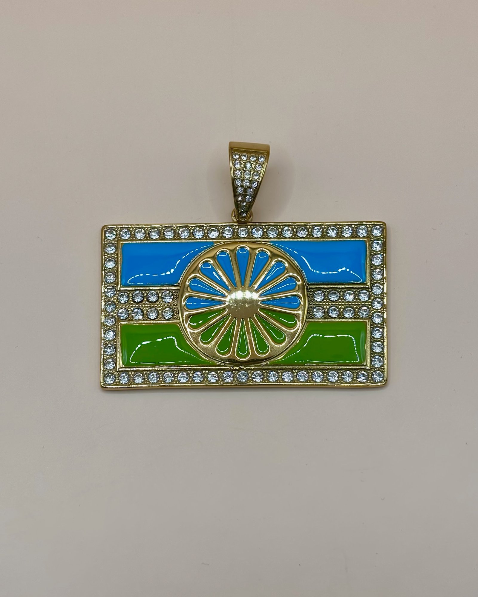 Placa rectangular esmaltada en azul y verde, con rueda gitana central y marco de circonitas que aporta brillo. Acabado dorado y asa reforzada, elegante y muy llamativa.