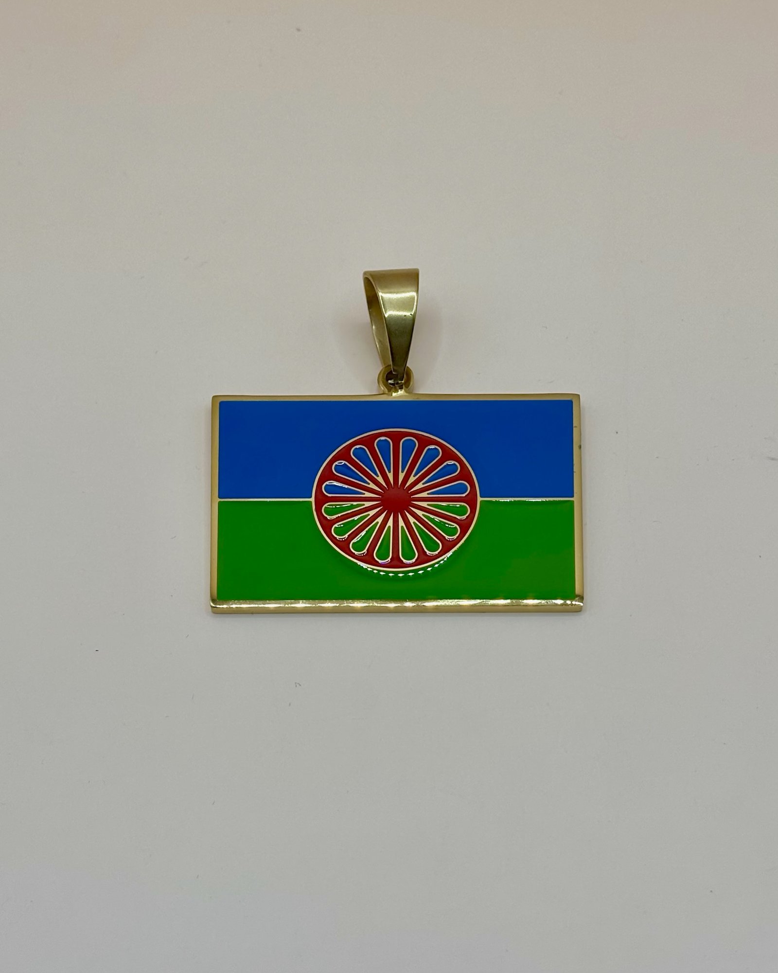 Placa rectangular con esmalte azul y verde y rueda gitana roja en el centro, enmarcada en acabado dorado. Diseño vistoso y simbólico, con asa resistente. Ideal para llevar a diario o regalar.