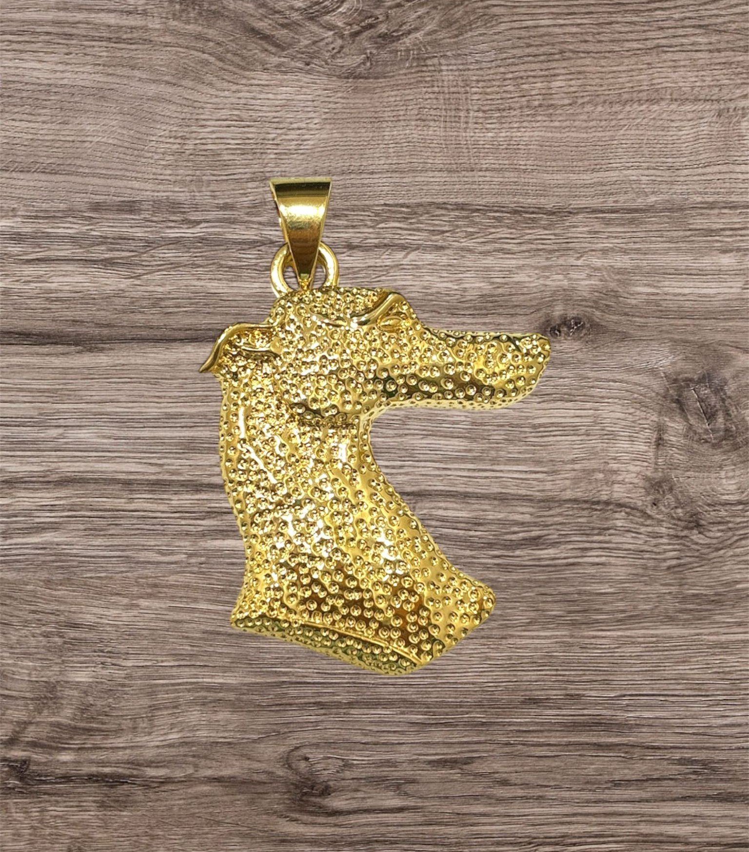 Medalla grande en acero inoxidable dorado con un diseño detallado de la cabeza de un galgo. Una pieza elegante y distintiva para los amantes de esta noble raza.