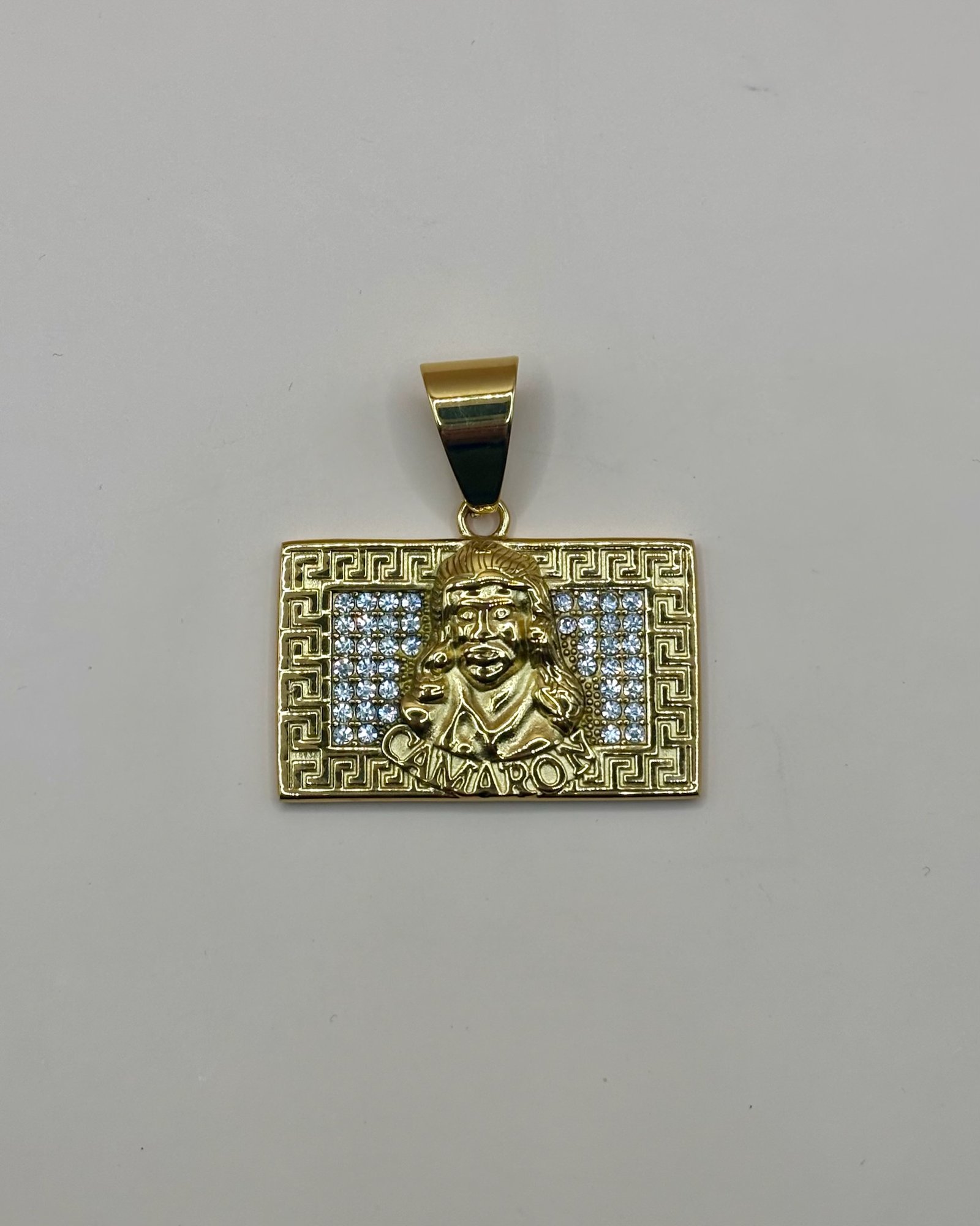 Esta medalla presenta una figura estilizada del legendario cantante Camarón de la Isla, con un diseño dorado que captura su rostro con detalles escultóricos. La pieza resalta su expresión carismática, rodeada por un fondo adornado con pequeñas piedras brillantes que le dan un toque de distinción. El colgante, con un estilo elegante y lujoso, refleja la esencia del flamenco, el arte y la pasión de Camarón. Ideal para los amantes de la música y la cultura española, esta medalla es una pieza única que honra la memoria de un ícono del flamenco.