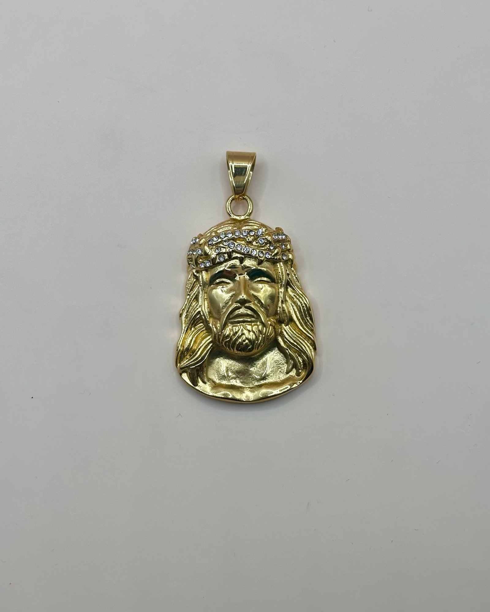 Medalla en acero inoxidable dorado con la cara de Cristo y una corona decorada con detalles brillantes. Una pieza significativa y sofisticada para hombres.