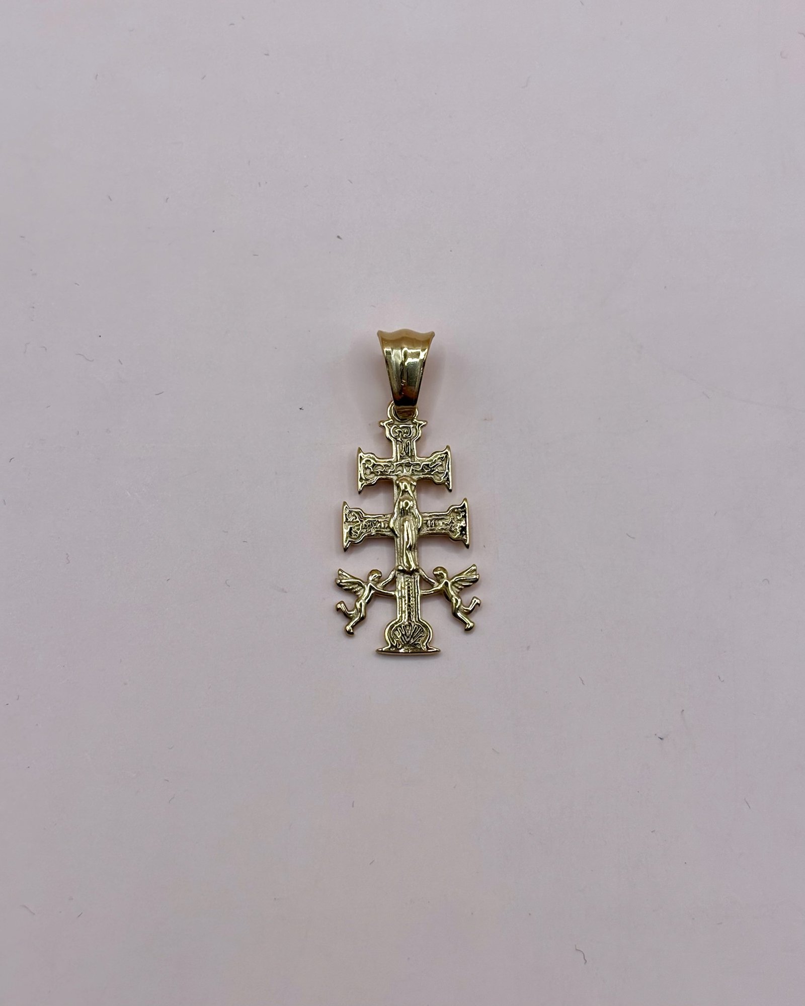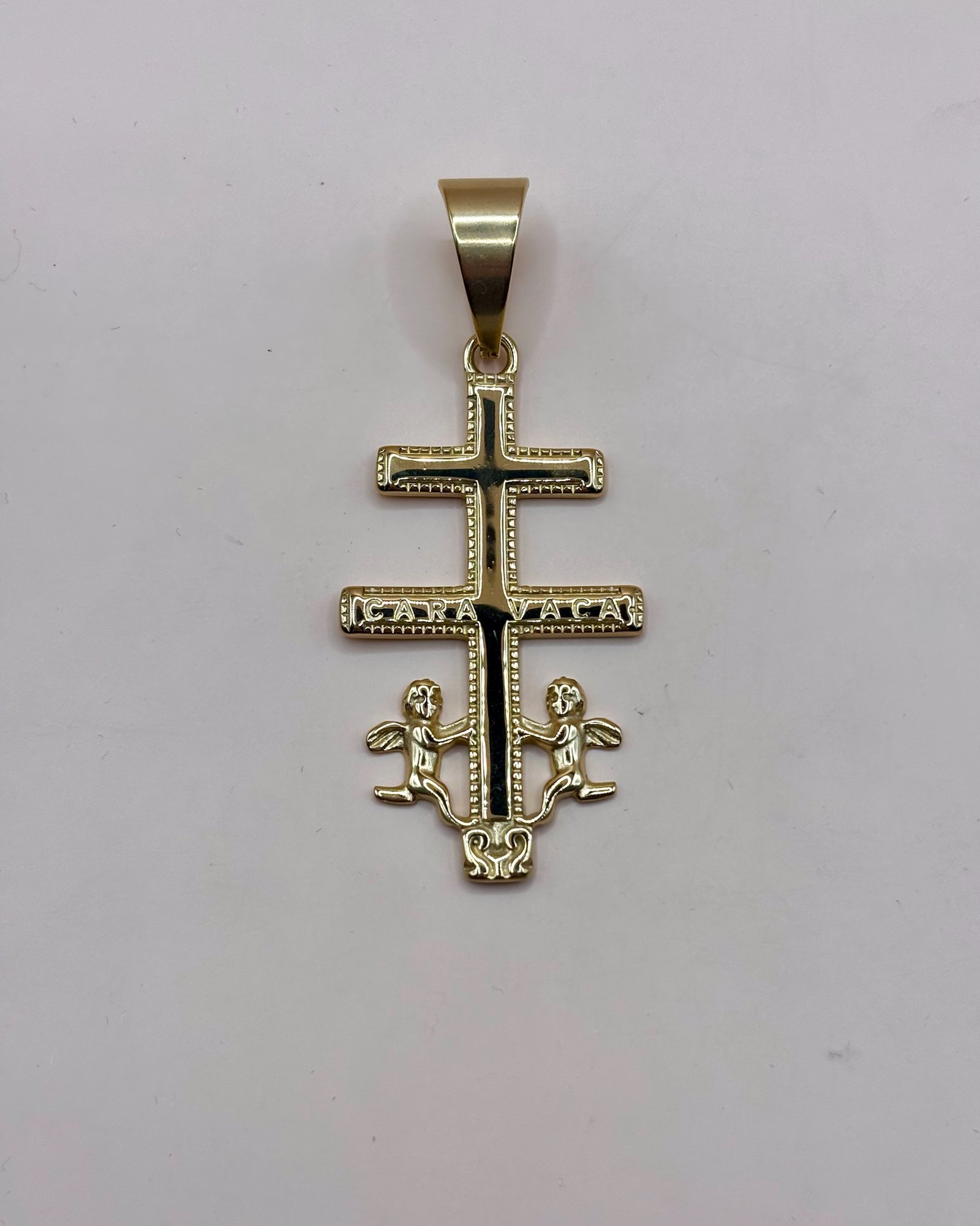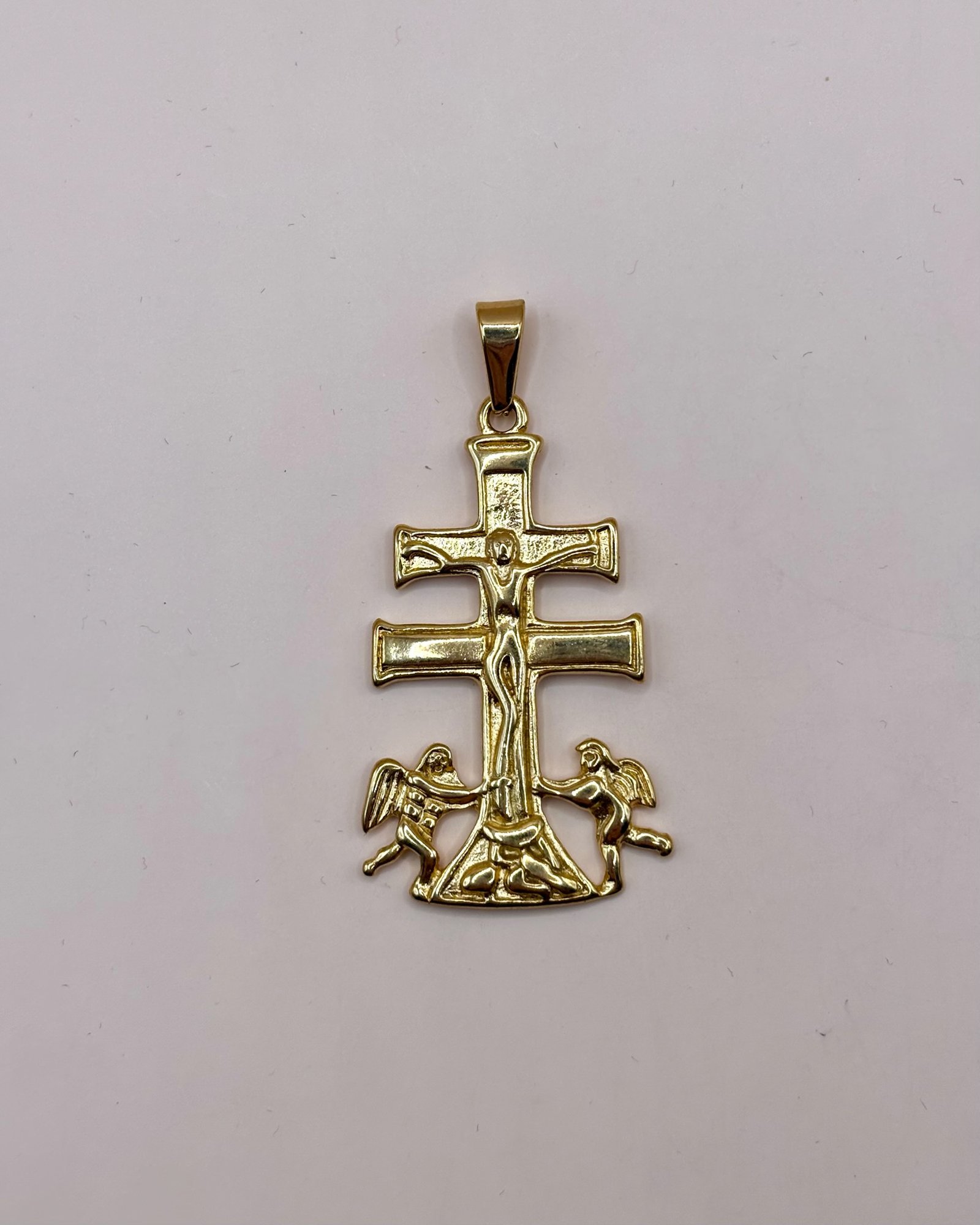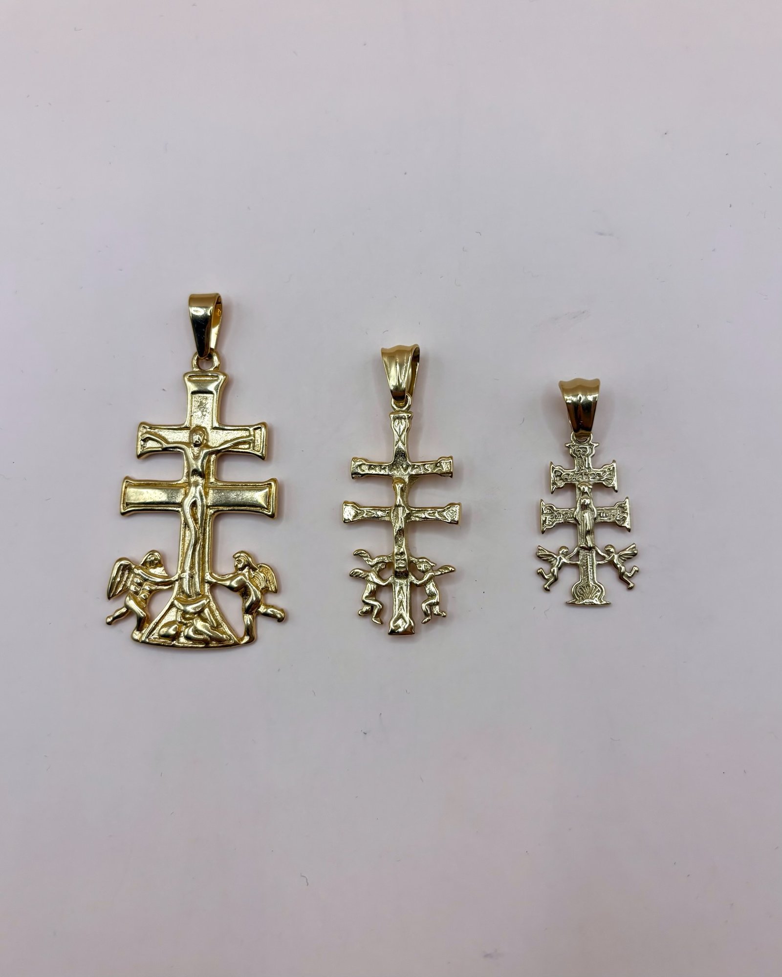 Medalla de acero inoxidable con diseño de la Cruz de Caravaca, un símbolo de protección y espiritualidad. Disponible en tamaños S, M, L y XL, es una pieza versátil para hombres, mujeres y niños.