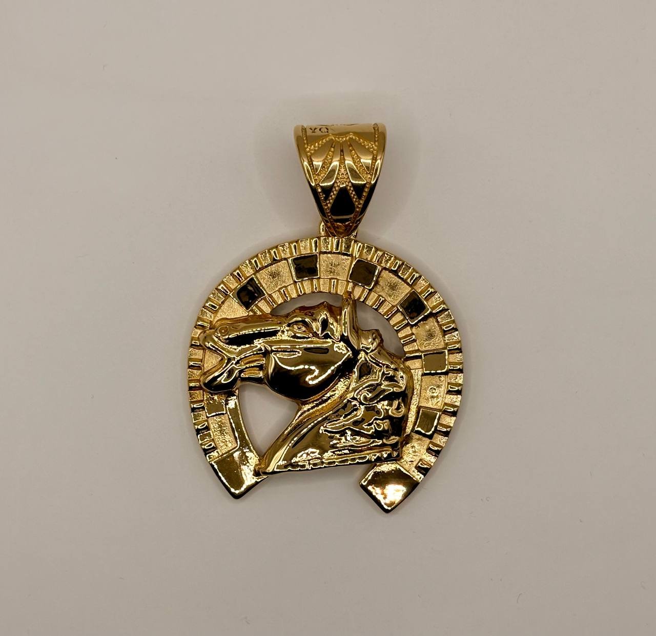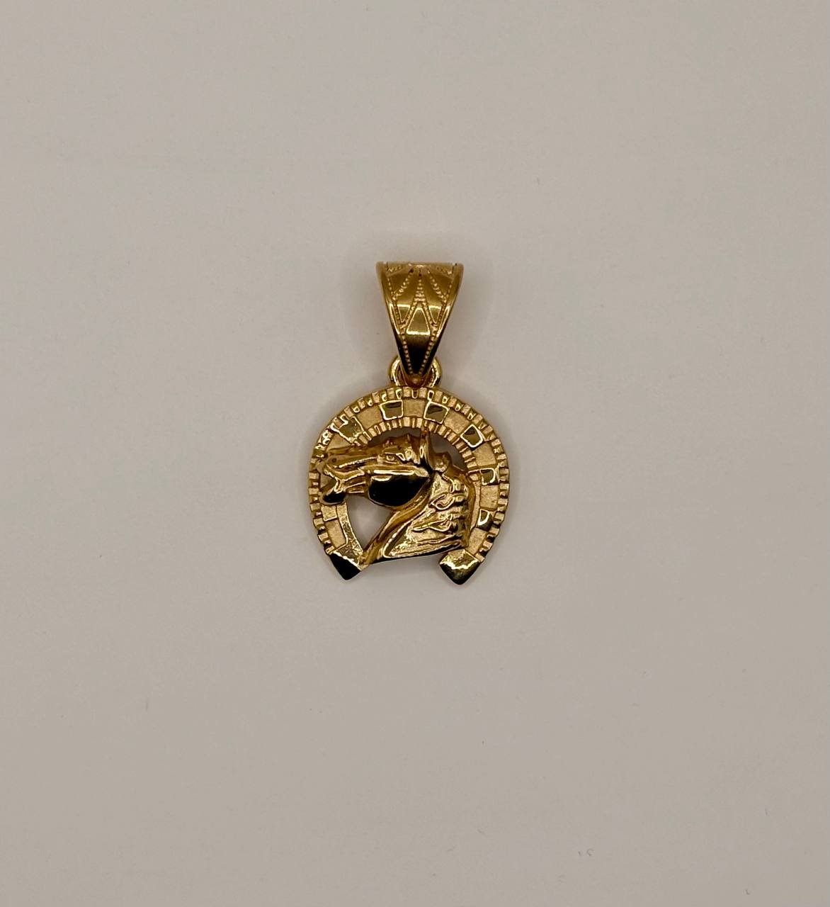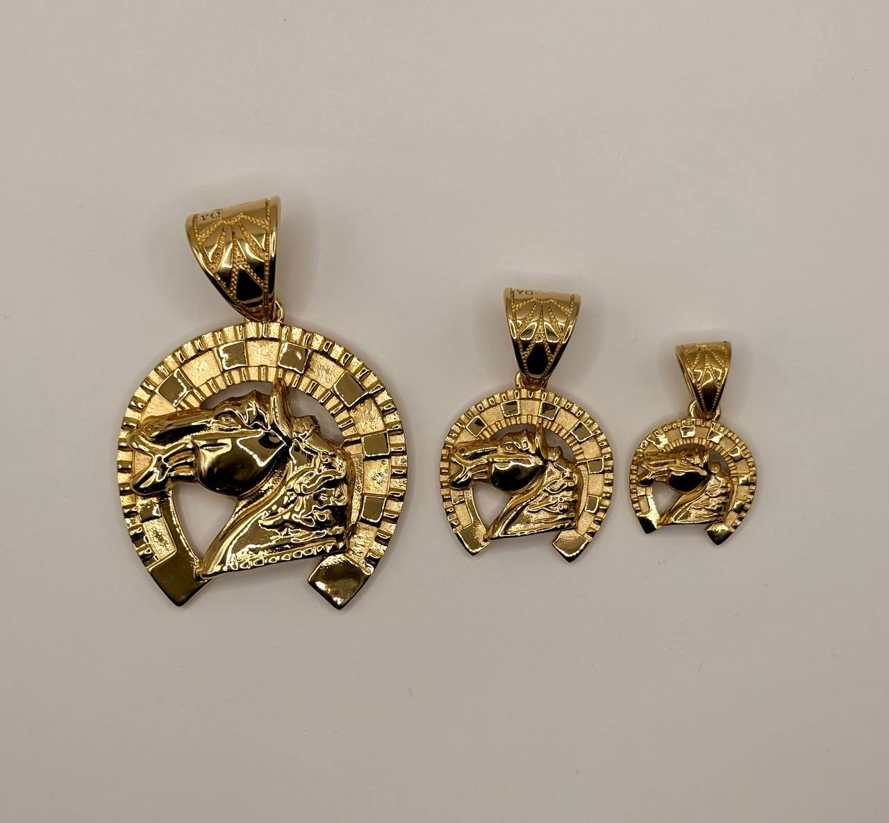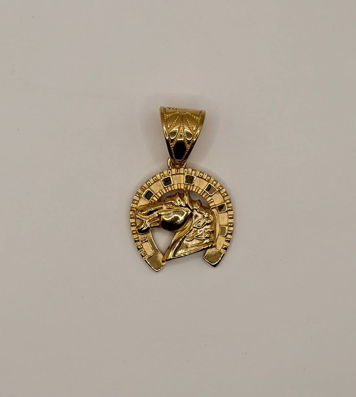 Medalla en acero inoxidable dorado con diseño de herradura, disponible en varios tamaños: S, M, L y XL. Ideal para quienes buscan un símbolo de buena suerte con un diseño robusto y elegante.