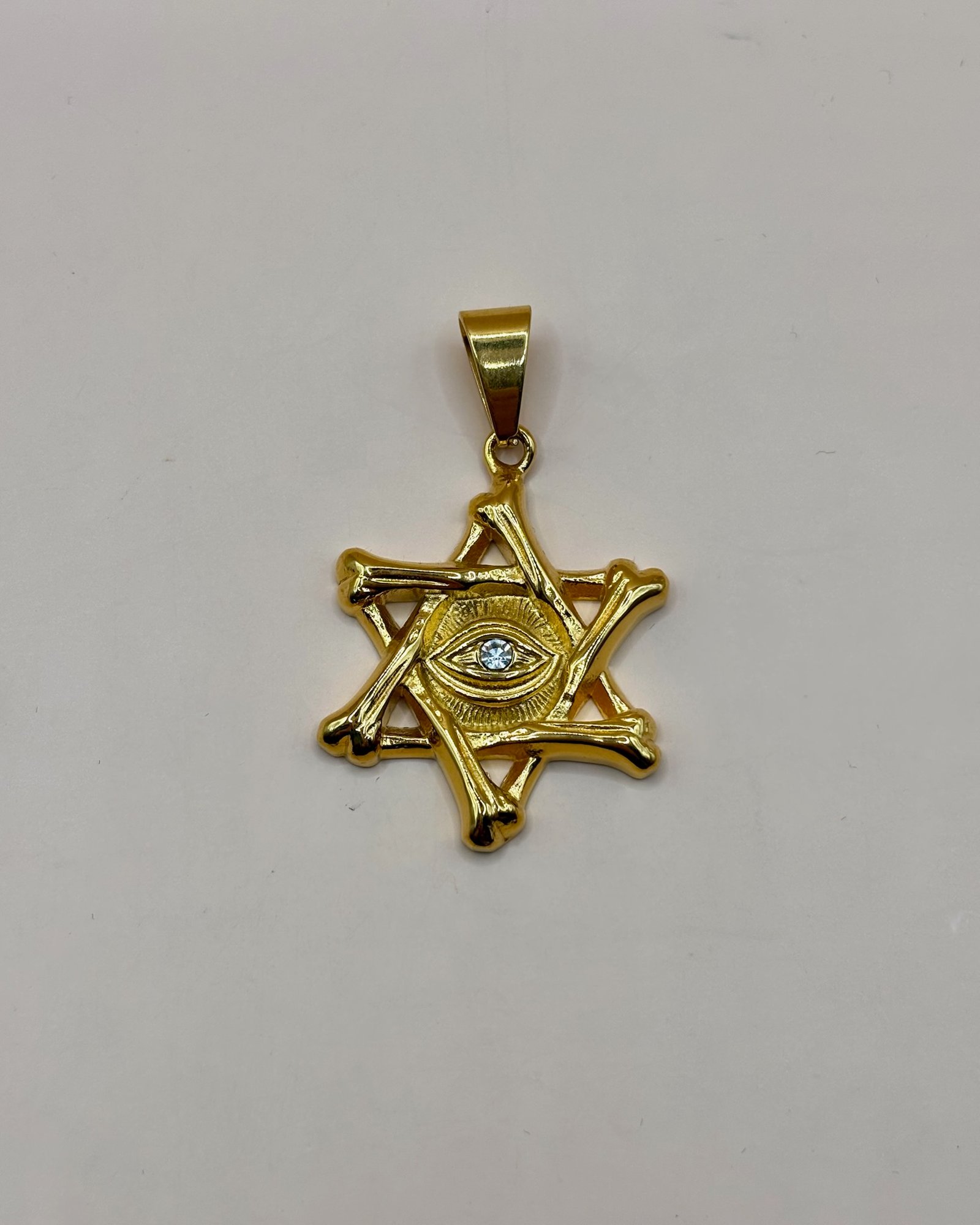 Medalla dorada con Estrella de David, de diseño original y acabado brillante. En el centro destaca un ojo en relieve con circonita, que aporta simbolismo y un toque de luz. Una pieza llamativa, elegante y con fuerte significado espiritual.