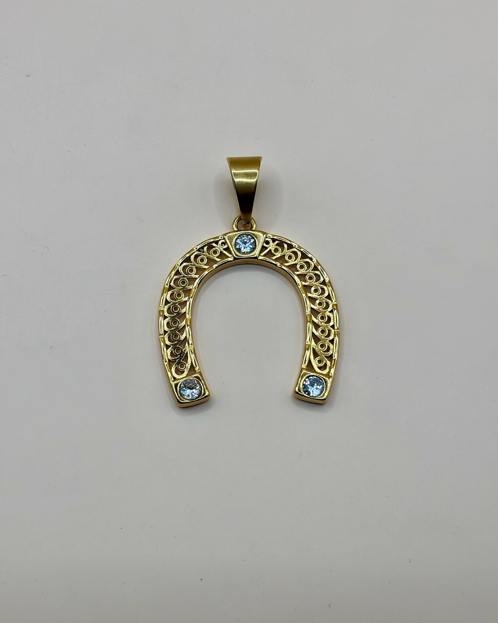Colgante dorado en forma de herradura, con trabajo calado y tres brillantes engastados que aportan luz y elegancia. Un diseño clásico y simbólico, asociado a la suerte y la protección, con un acabado fino y muy vistoso.