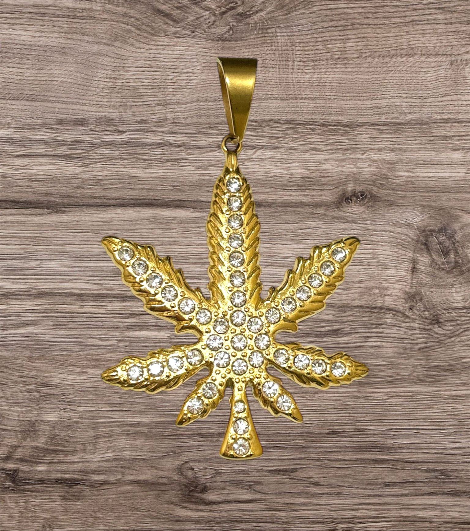 Medalla en acero inoxidable dorado con diseño de hoja de marihuana decorada con circonitas. Su tamaño XL y detalles brillantes la hacen un accesorio llamativo y moderno para hombres que buscan un estilo audaz.