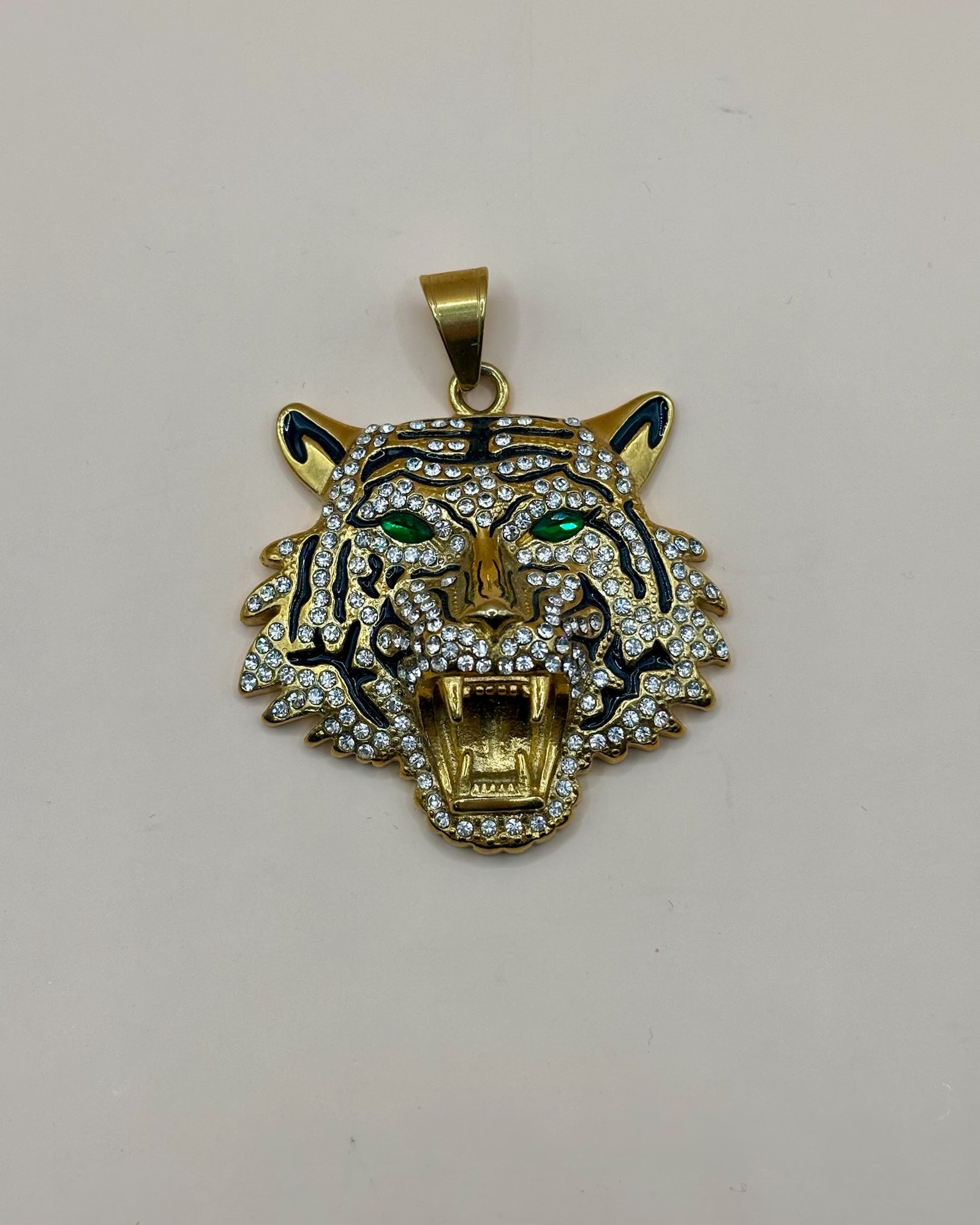 Este colgante de tigre está meticulosamente diseñado, con una abundancia de cristales brillantes que adornan su cara feroz. Los ojos verdes del tigre proporcionan un contraste llamativo, mientras que la expresión del tigre transmite poder y determinación, ideal para quienes buscan un accesorio audaz y elegante.