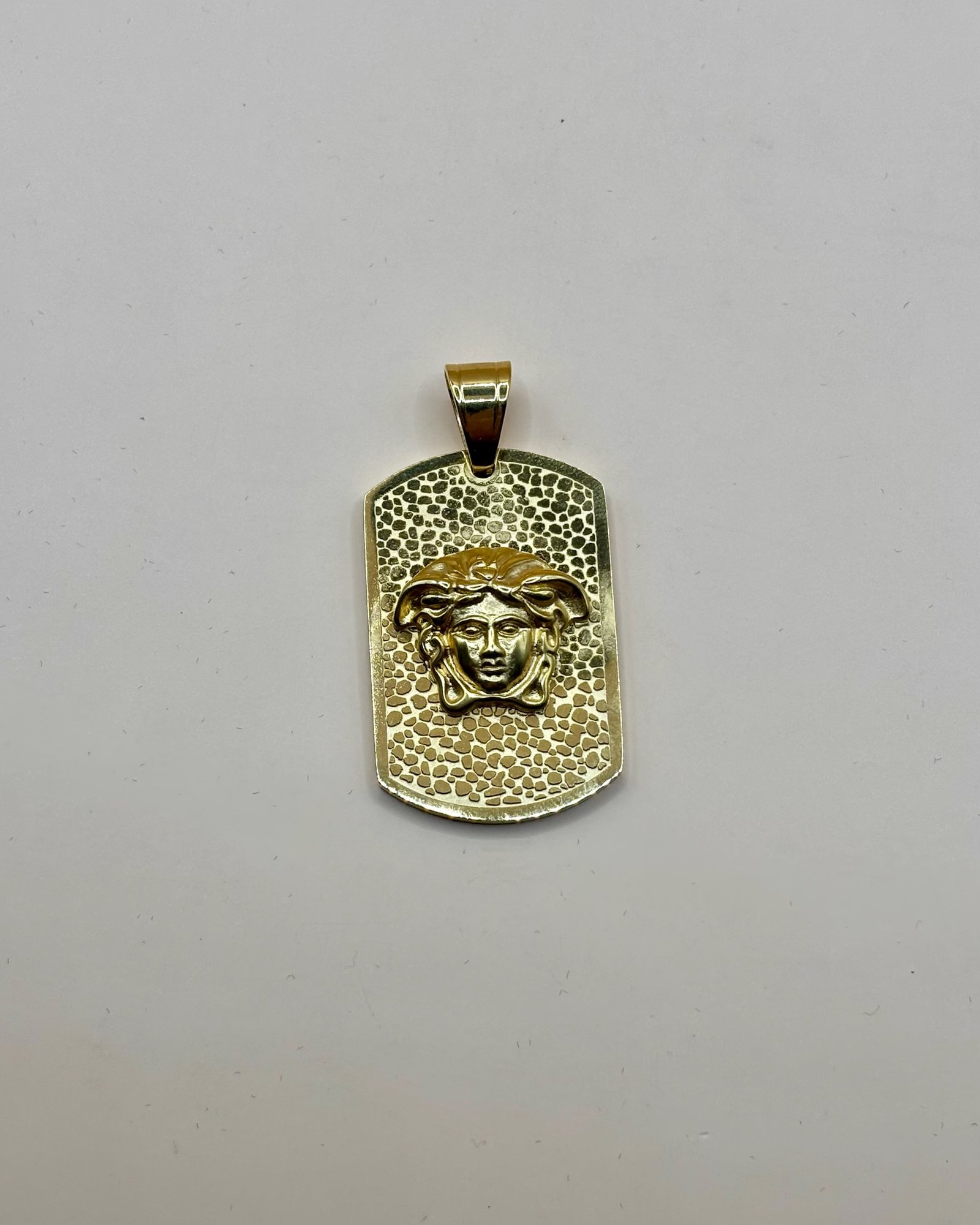 Este colgante rectangular presenta la cabeza de Medusa en relieve, con un acabado dorado que resalta su poderosa figura. El fondo texturizado con un patrón de piedras le da una apariencia rústica y distintiva, aportando un contraste elegante con la figura central. La medalla simboliza la fuerza y majestuosidad de Medusa, fusionando lo antiguo con lo moderno. Ideal para quienes buscan un accesorio único que combine elegancia y poder.