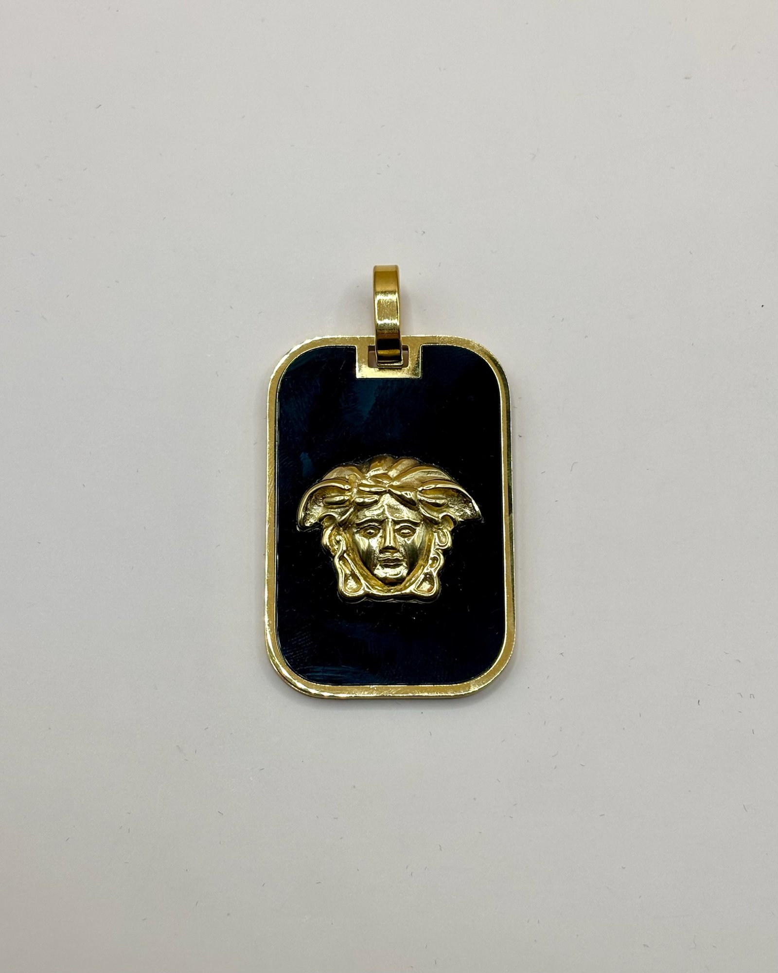 Colgante rectangular con la cabeza de Medusa en relieve, sobre un fondo de negro brillante que resalta la figura dorada. El marco dorado aporta un contraste elegante y sofisticado, creando un equilibrio entre el poder y la distinción. Ideal para quienes buscan un accesorio que combine fuerza, misterio y lujo.