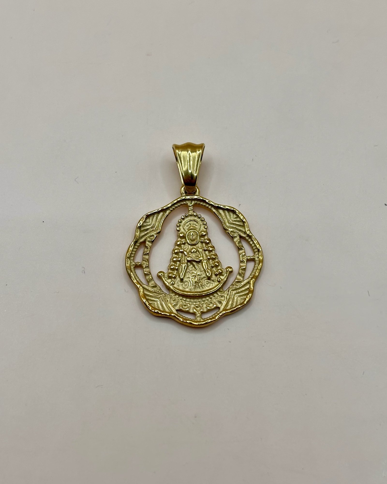 Medalla dorada de estilo religioso con imagen central de la Virgen, rodeada por un marco calado ondulado con relieves decorativos. Acabado pulido y detalles bien definidos que aportan elegancia y simbolismo.