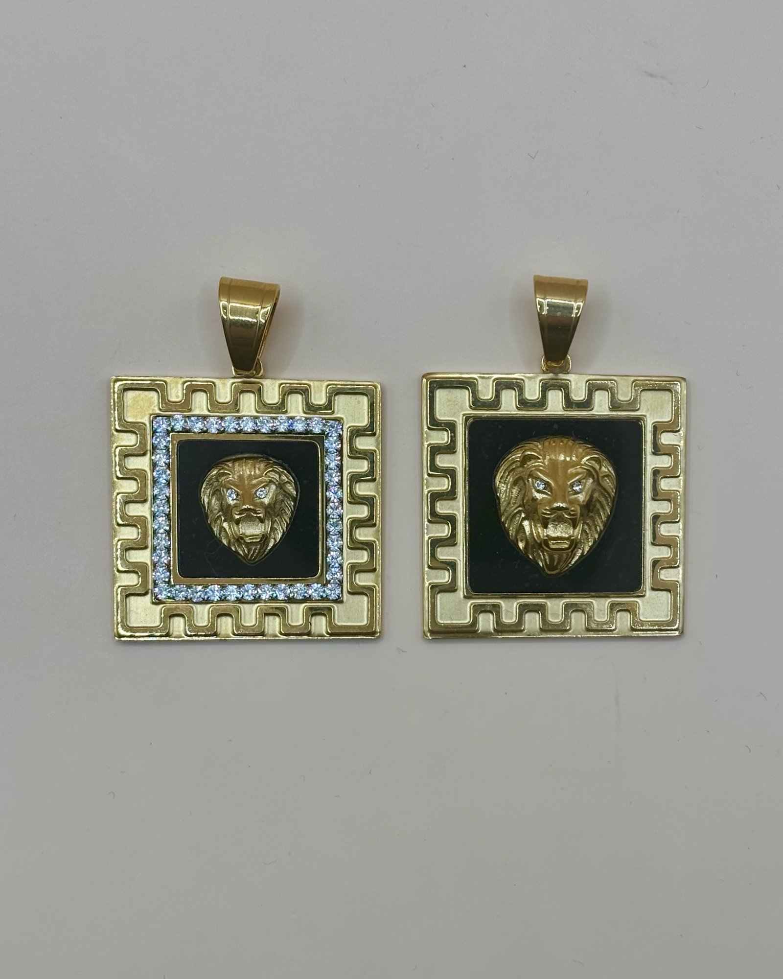 Colgantes de diseño cuadrado con una cabeza de león en relieve, que destaca como pieza central. Una enmarcada por una elegante greca Versa, los detalles de cristales en el borde realzan la majestuosidad de la pieza. La otra disponible en acabado negro, también con laterales grabados que refuerzan su poder. Perfecto para quienes buscan un accesorio que combine elegancia y fuerza.