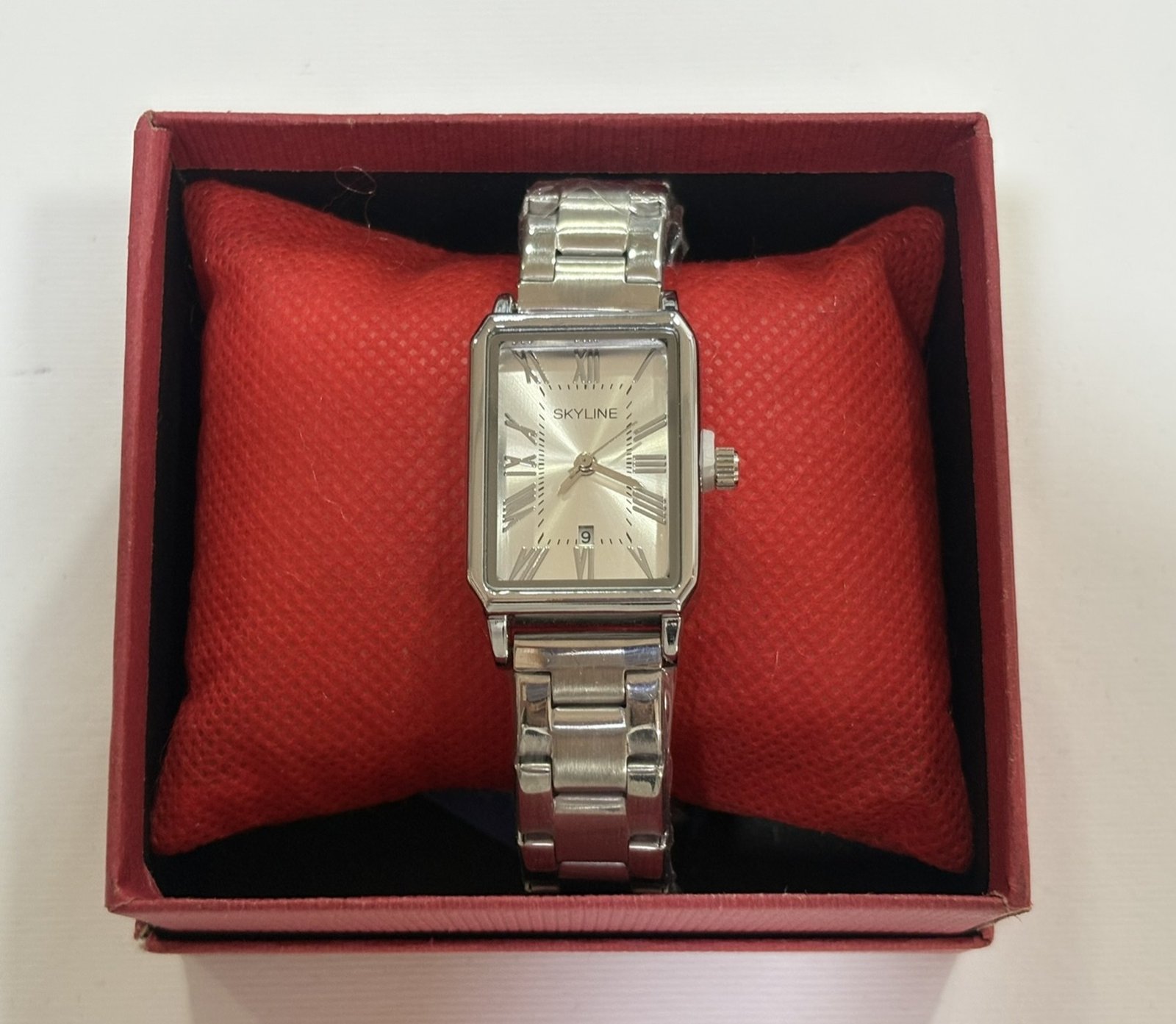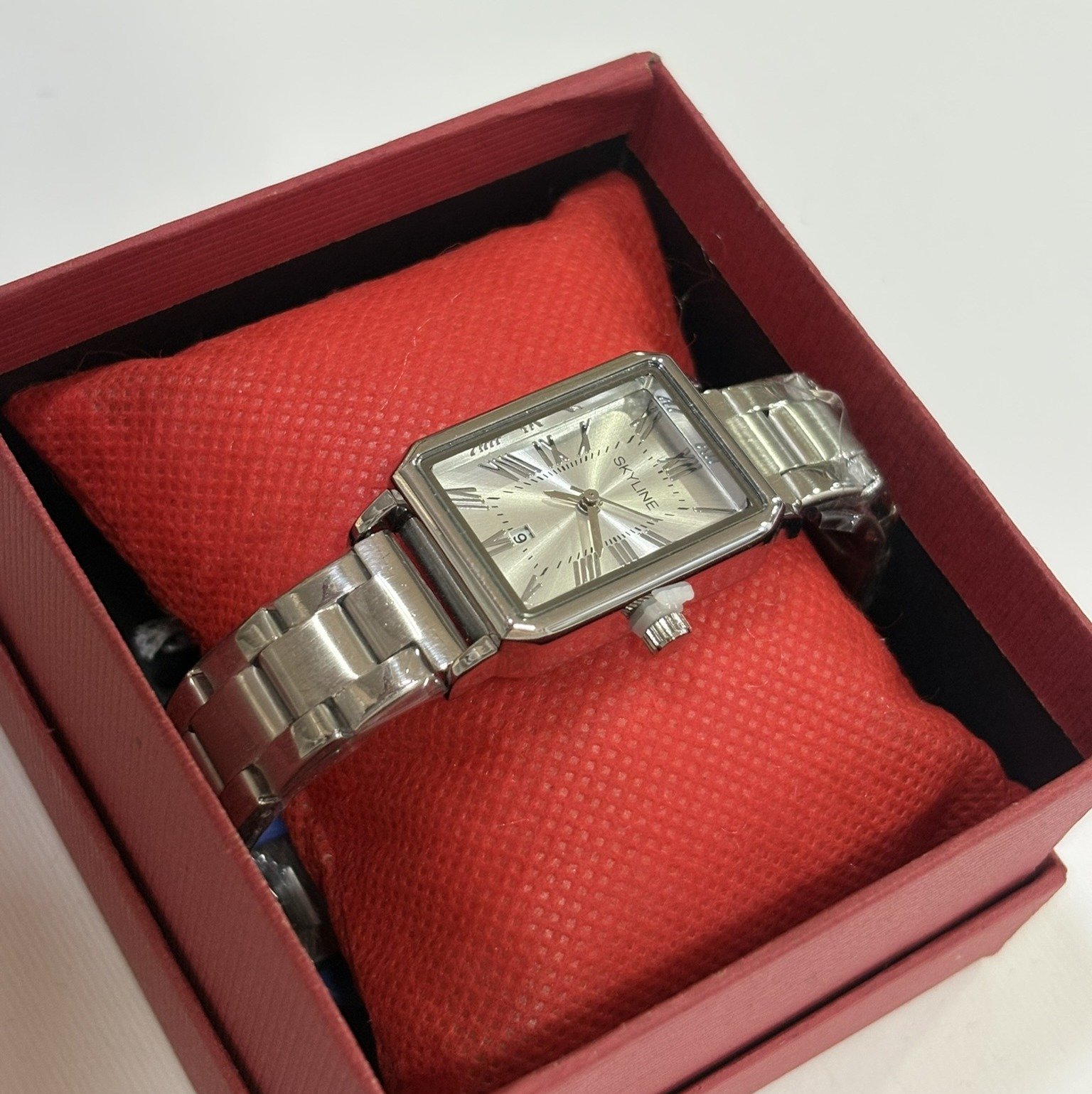 Reloj de acero inoxidable en acabado plateado, diseño elegante con esfera rectangular, números romanos y calendario integrado. Un accesorio sofisticado que aporta clase, precisión y estilo atemporal. ✨⌚