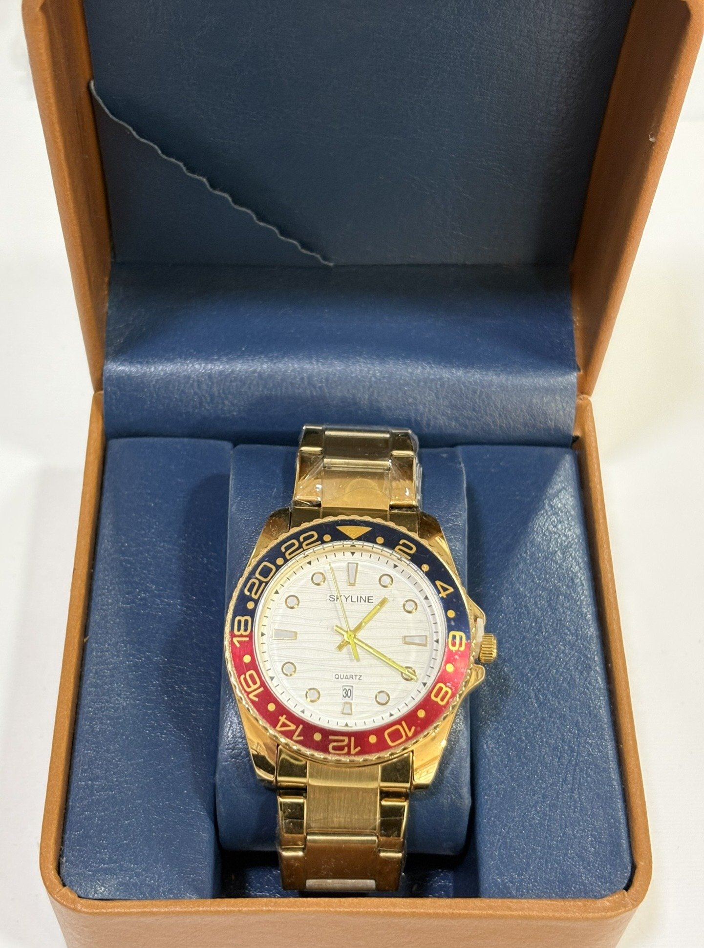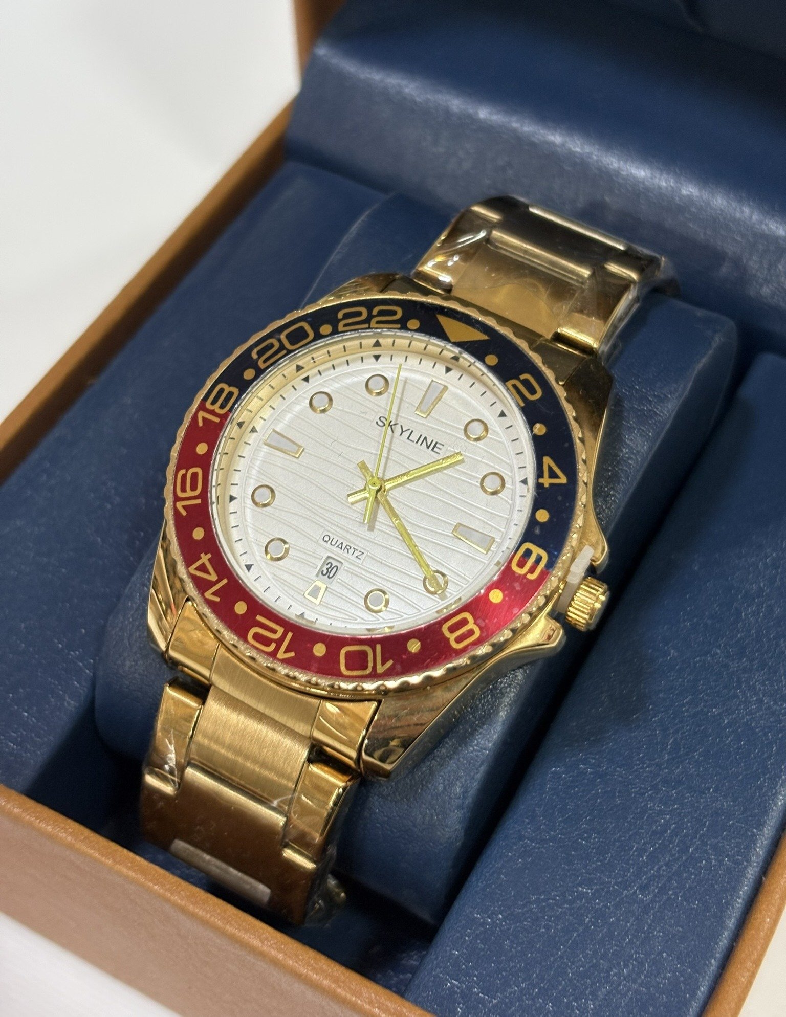 Reloj de acero inoxidable con acabado dorado y estilo deportivo elegante. Esfera limpia con calendario y bisel bicolor que aporta personalidad y dinamismo. Correa metálica resistente, ideal para un look moderno y sofisticado.