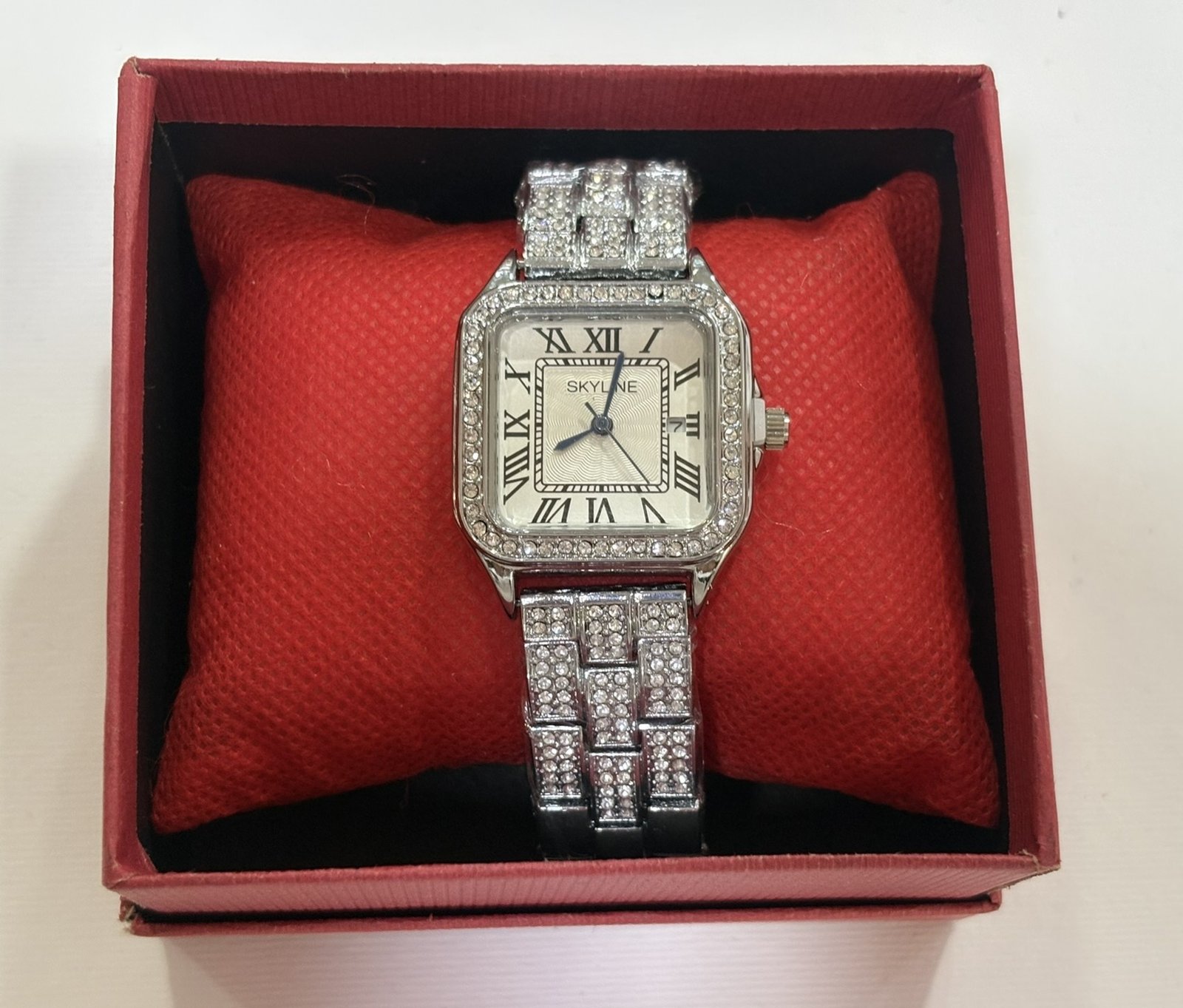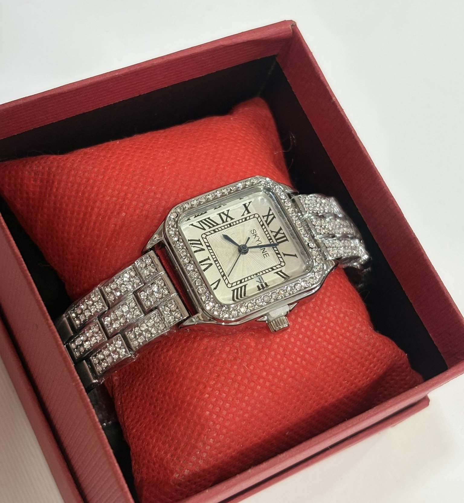 Reloj de acero inoxidable con acabado brillante y detalles de pedrería, diseño cuadrado con números romanos que aportan un estilo clásico y sofisticado. Un accesorio elegante que combina lujo, brillo y distinción para cualquier ocasión. ⌚✨