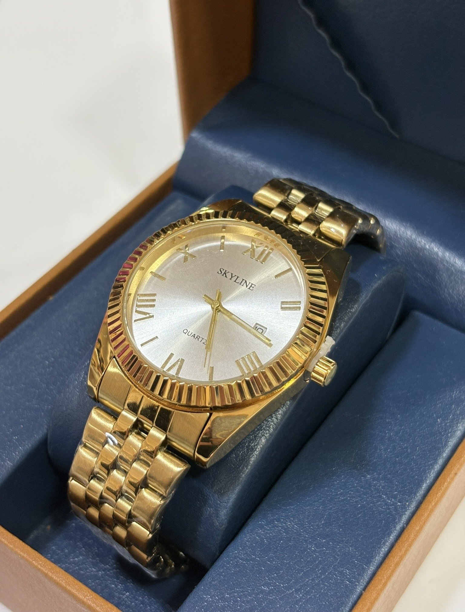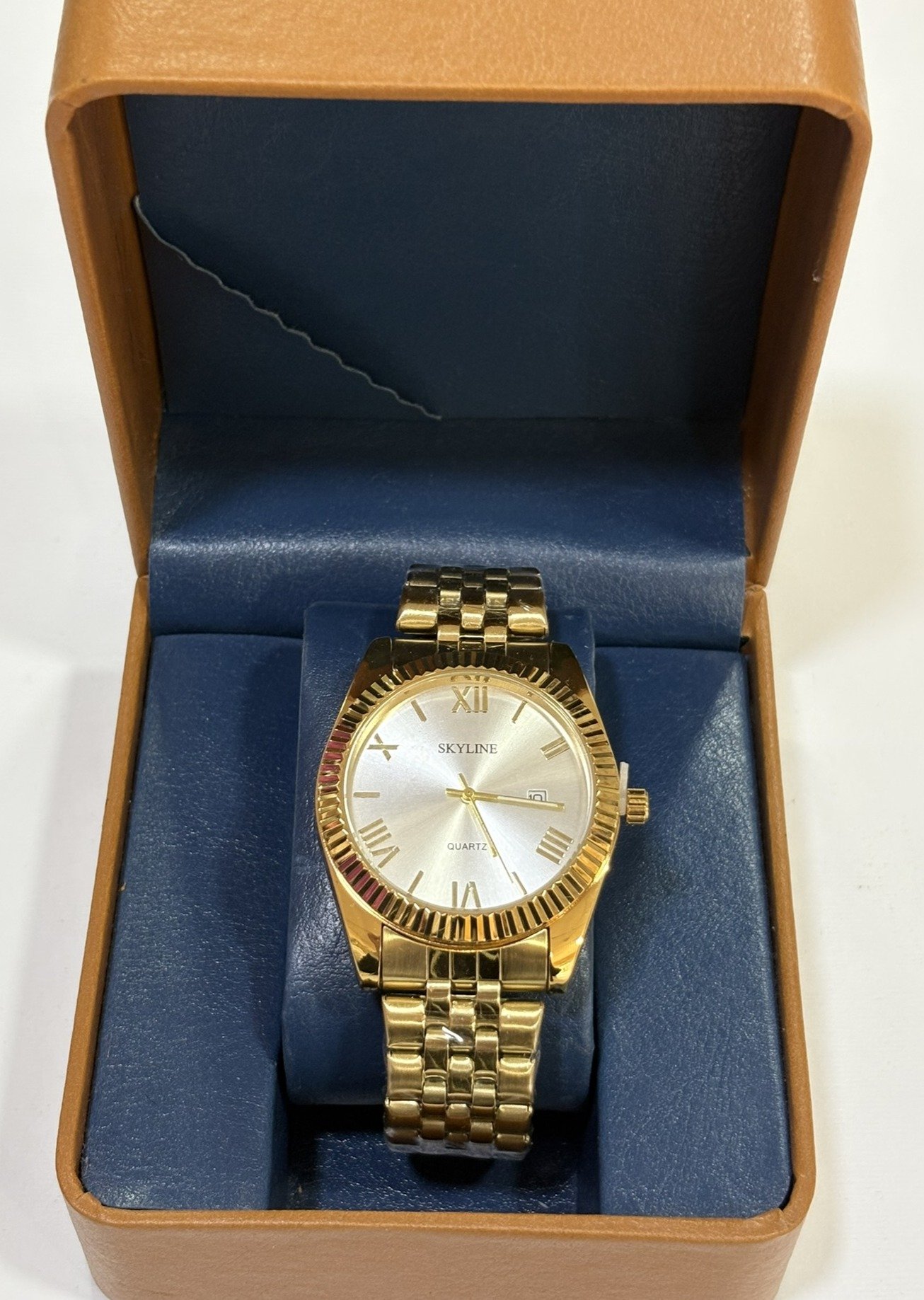 Reloj de acero inoxidable con acabado dorado y diseño clásico. Esfera limpia con números romanos y calendario integrado que aporta un estilo elegante y atemporal. Correa metálica resistente, ideal para un look sofisticado y refinado.
