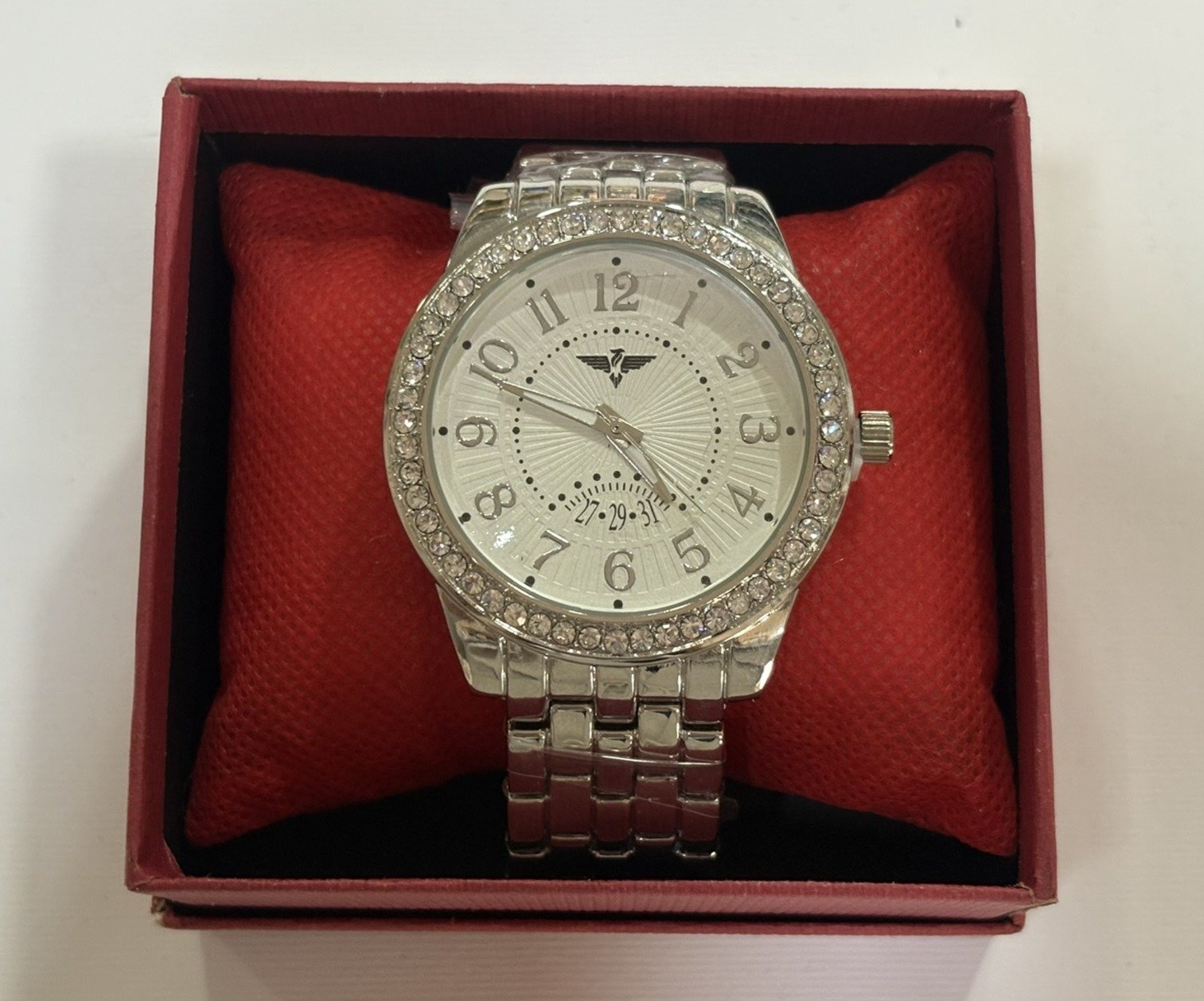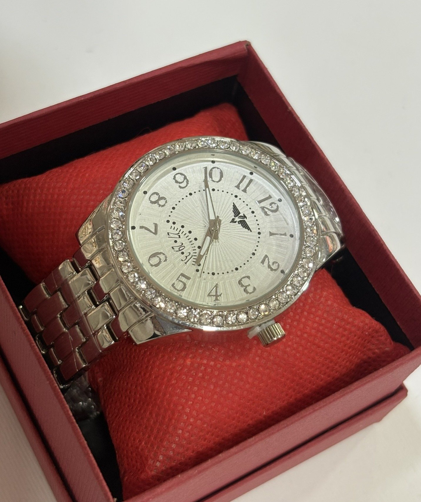 Reloj de acero inoxidable con bisel decorado con pedrería, esfera elegante con números grandes que aportan estilo y fácil lectura. Un accesorio sofisticado que combina brillo, elegancia y distinción para cualquier ocasión. ⌚✨