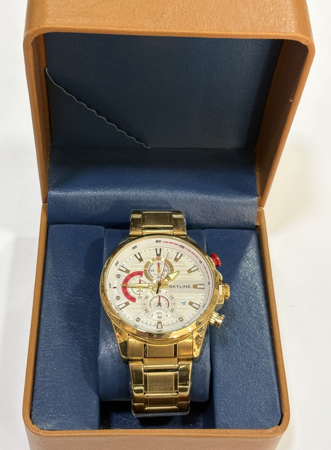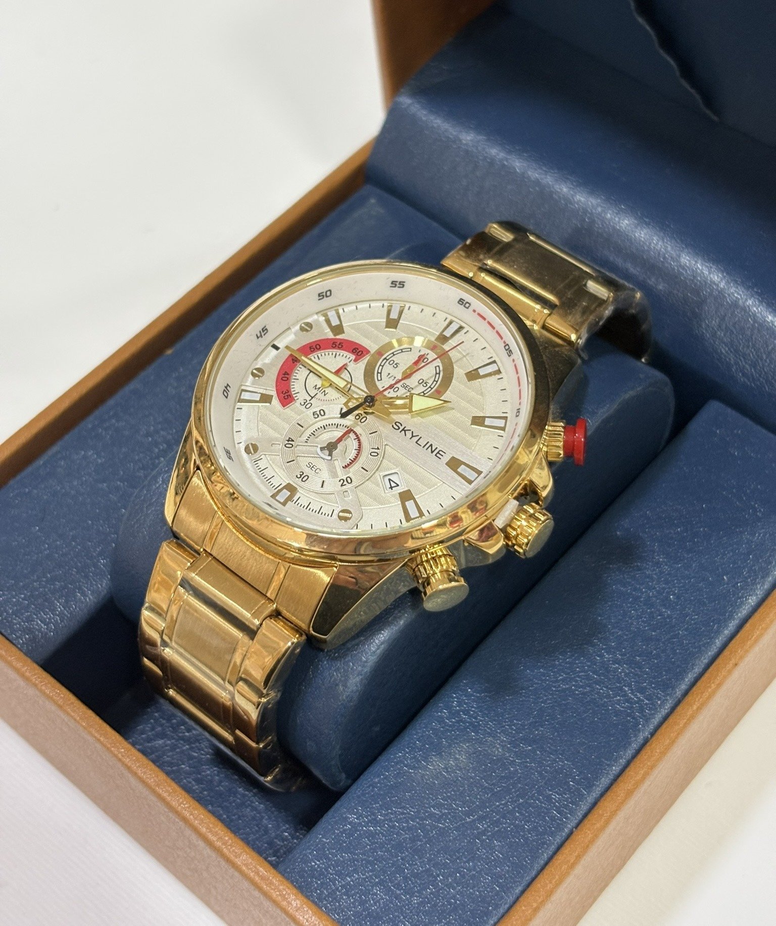Reloj de acero inoxidable con acabado dorado y diseño sofisticado. Esfera multifunción con detalles en contraste y subesferas que aportan dinamismo y precisión. Correa metálica resistente, ideal para un look elegante con carácter moderno.