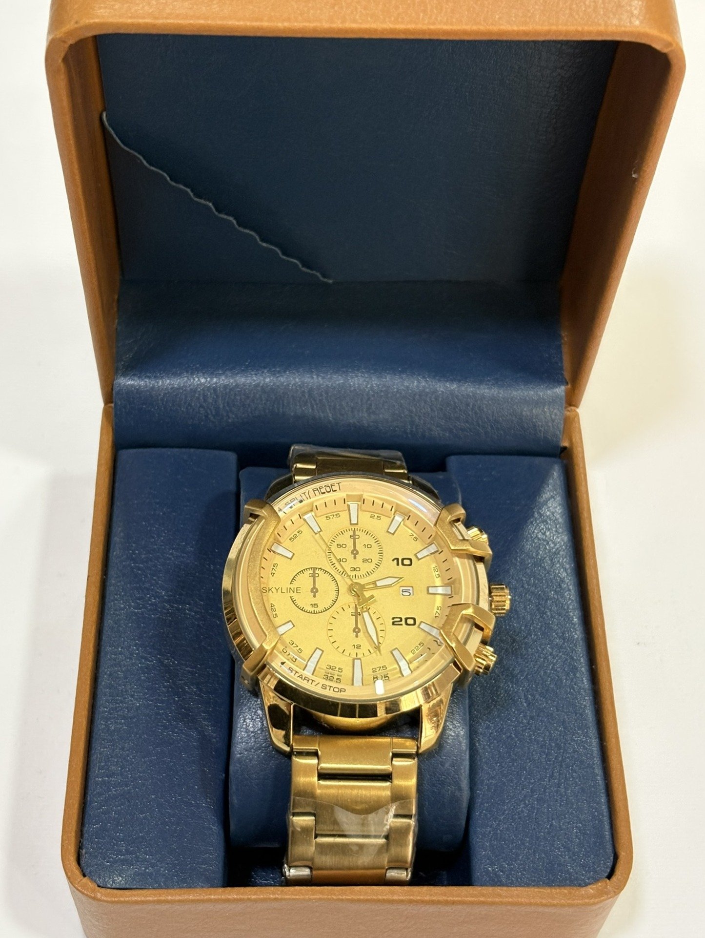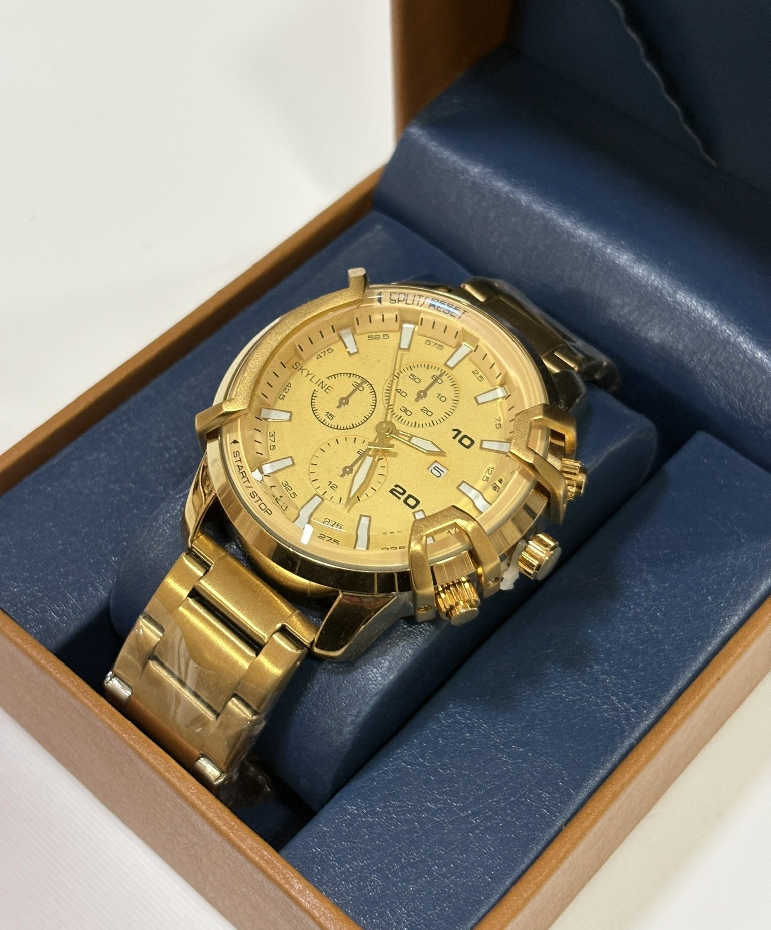 Reloj de acero inoxidable con acabado dorado y diseño deportivo elegante. Esfera multifunción con subesferas y estructura reforzada que aporta carácter y robustez. Correa metálica resistente, ideal para un look sofisticado y con personalidad.