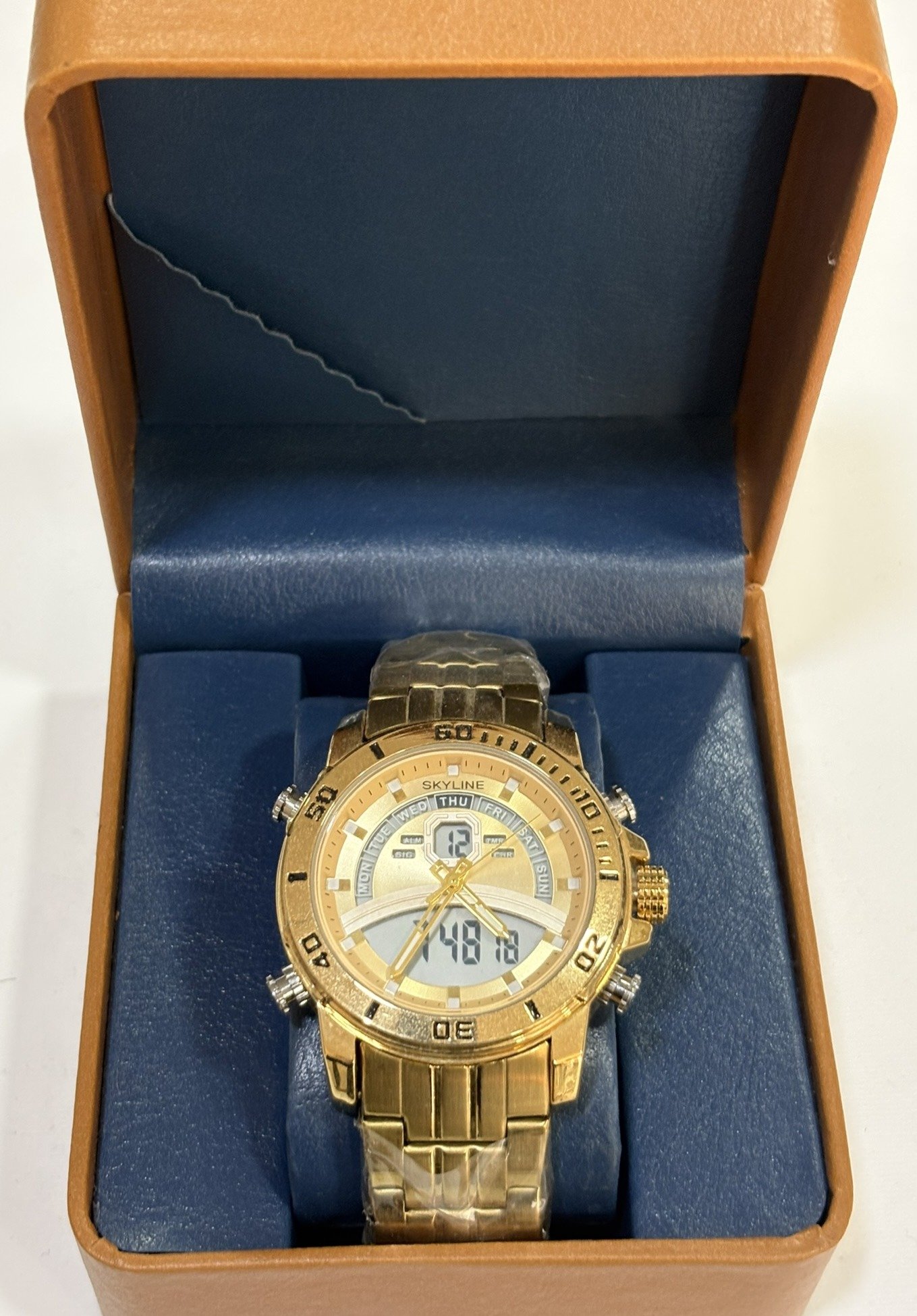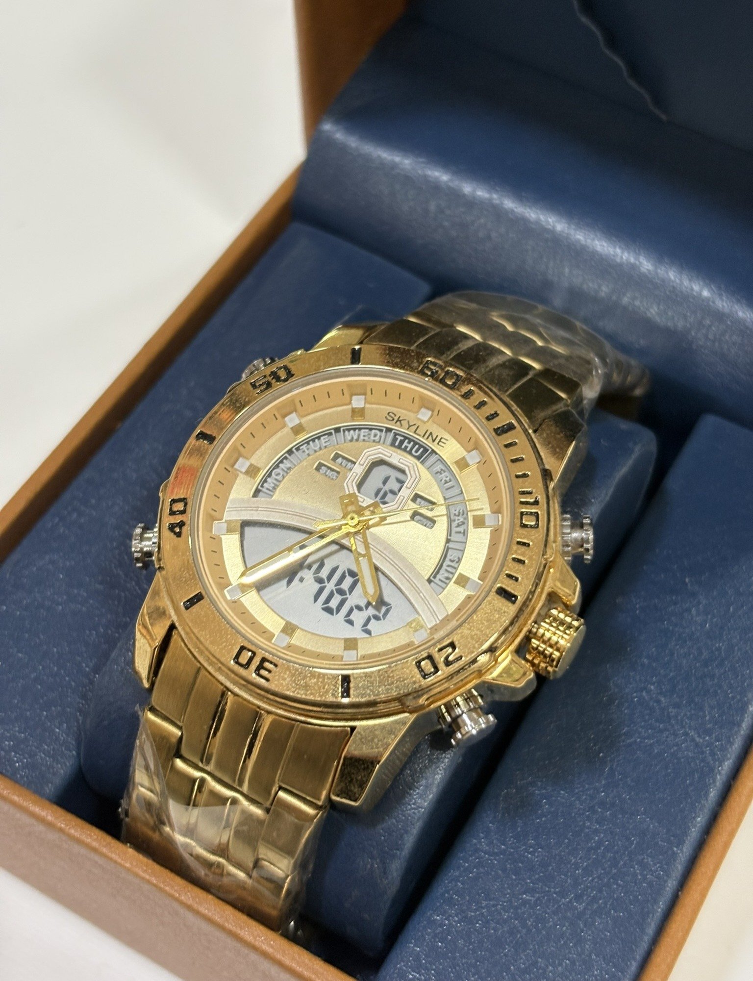 Reloj de acero inoxidable con acabado dorado y diseño deportivo elegante. Esfera analógica-digital con múltiples funciones y bisel marcado que aporta carácter y modernidad. Correa metálica resistente, ideal para un look sofisticado y versátil.