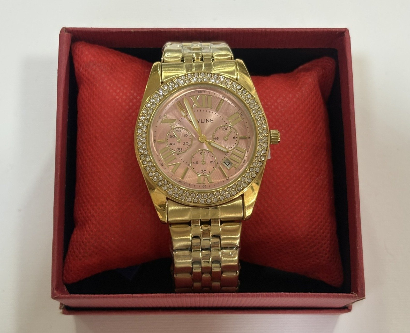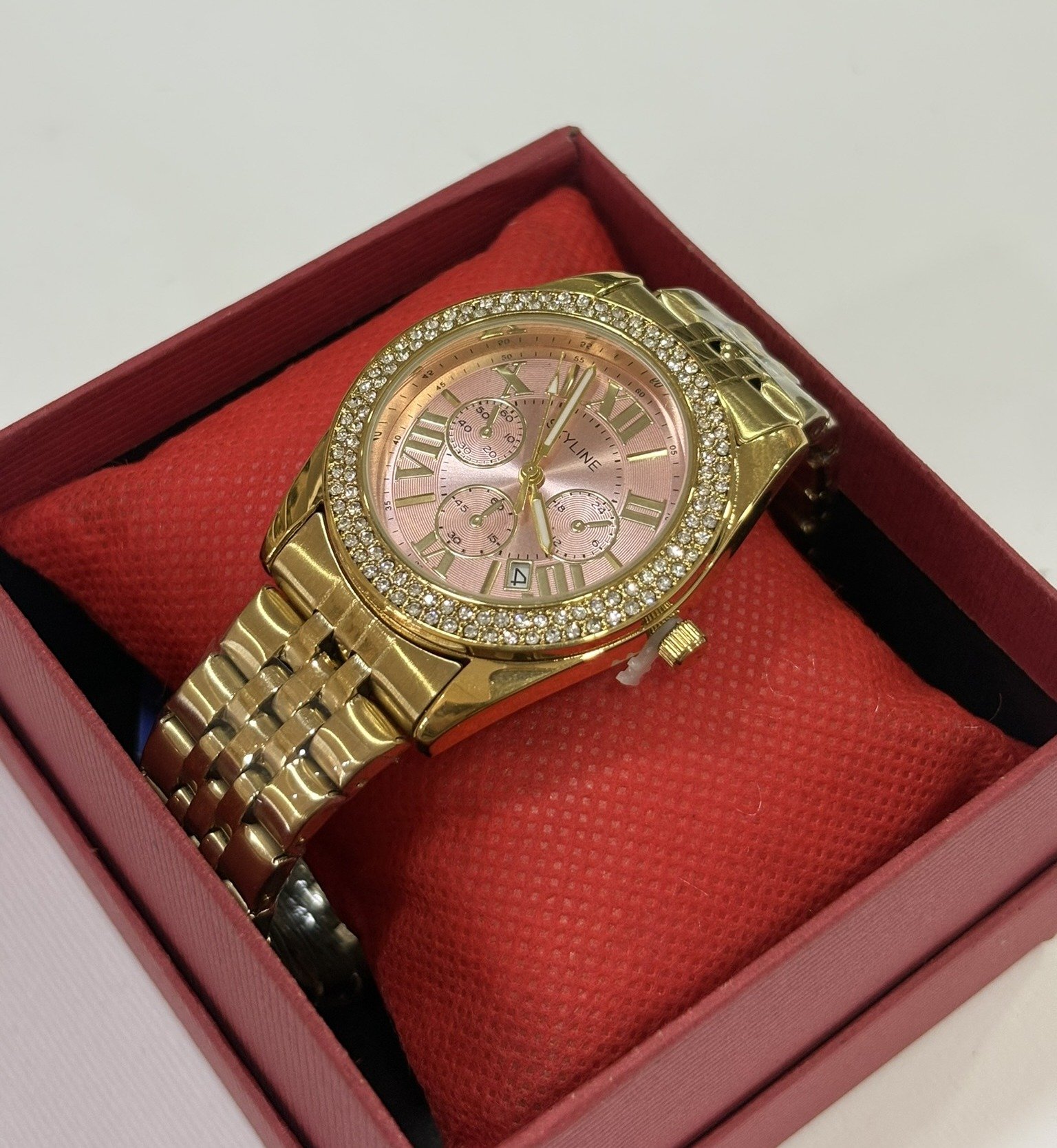 Reloj de acero inoxidable con acabado dorado que destaca por su estilo sofisticado. Esfera rosa con detalles en números romanos, subesferas decorativas y bisel con incrustaciones brillantes que aportan un toque de lujo. Movimiento quartz preciso y correa metálica resistente, ideal para un look elegante y exclusivo.