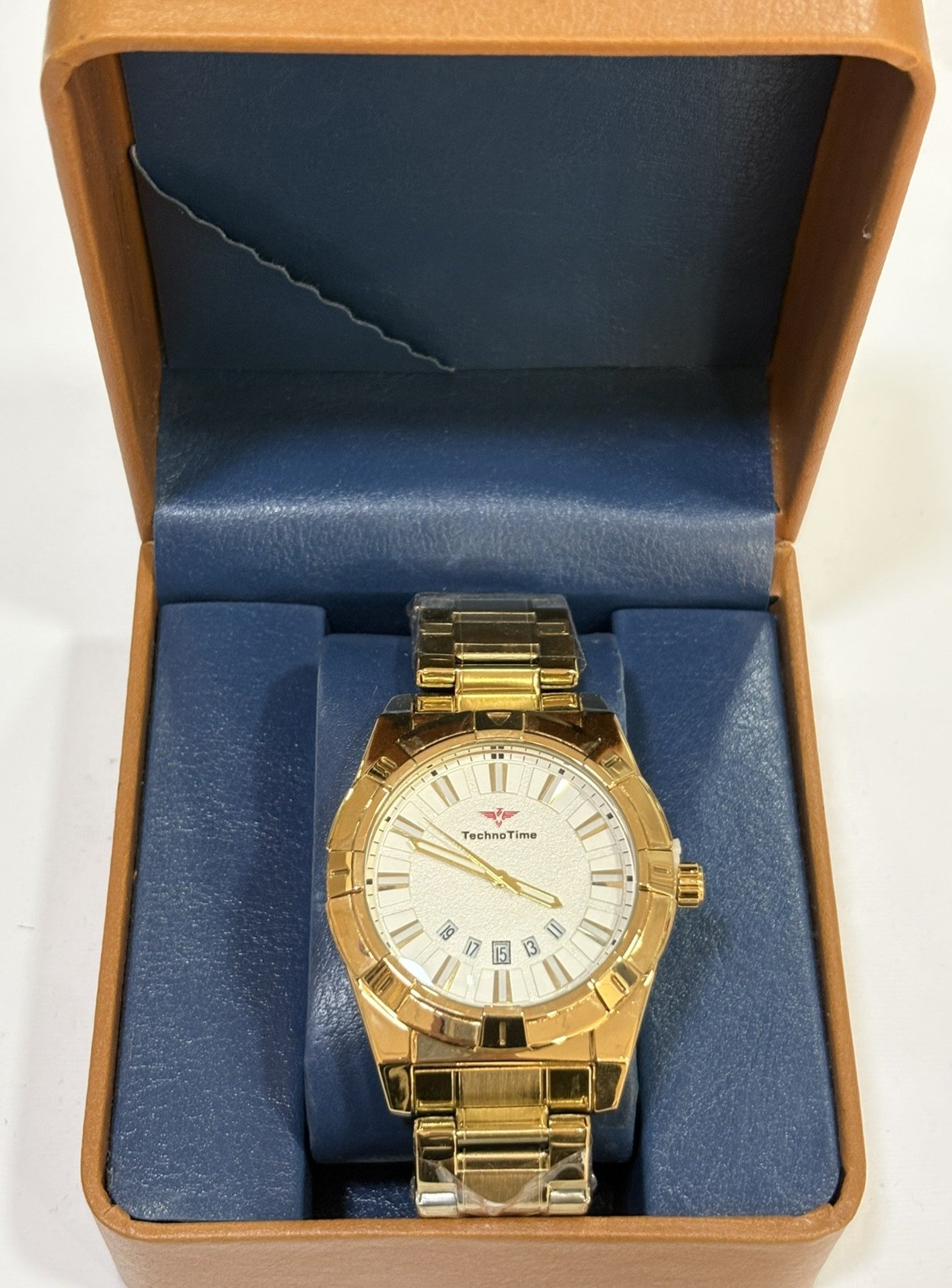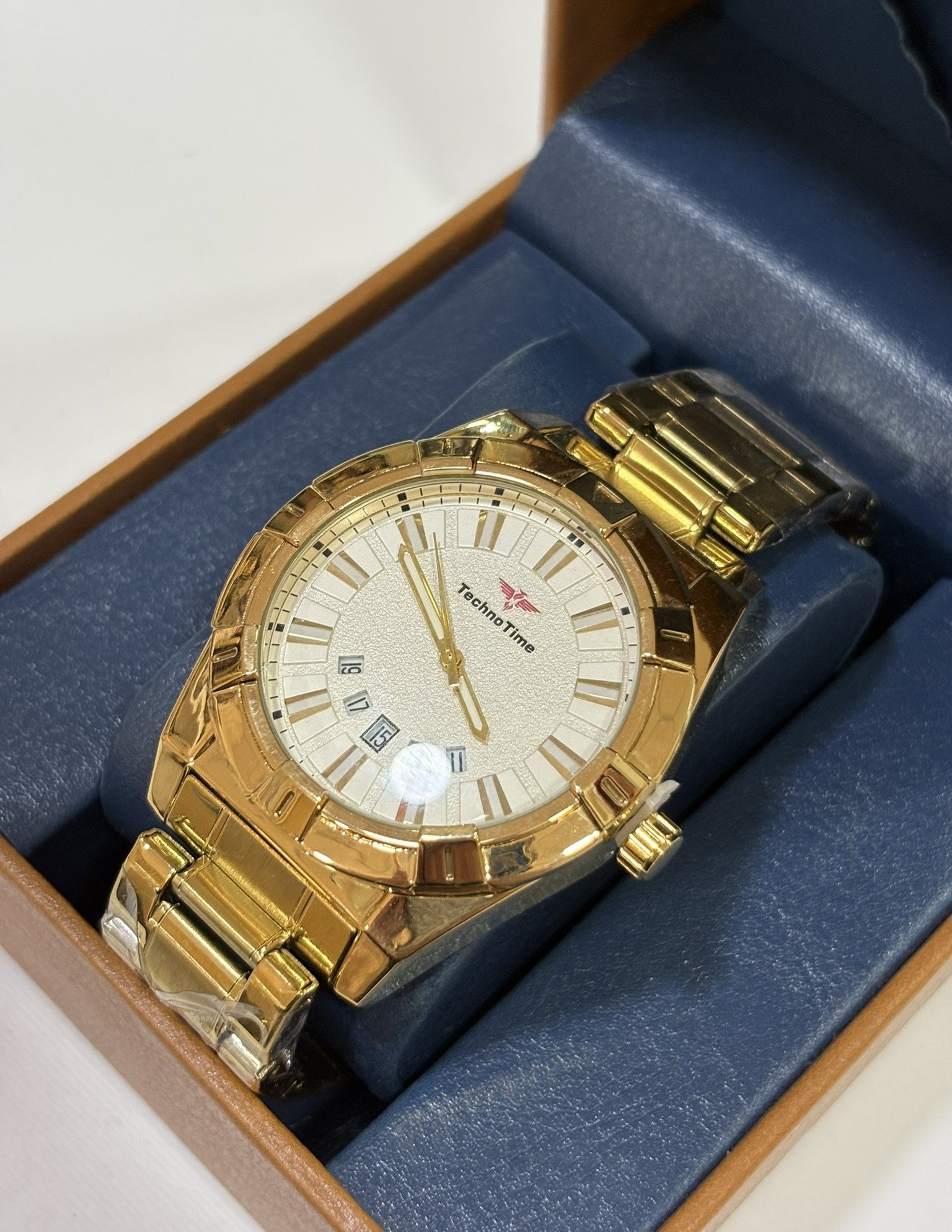 Reloj de acero inoxidable con acabado dorado y diseño elegante. Esfera texturizada con marcadores destacados y calendario integrado que aporta un estilo sofisticado y moderno. Correa metálica resistente, ideal para un look distinguido y versátil.