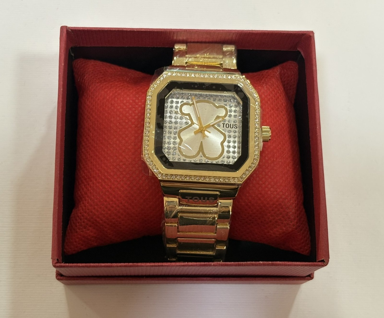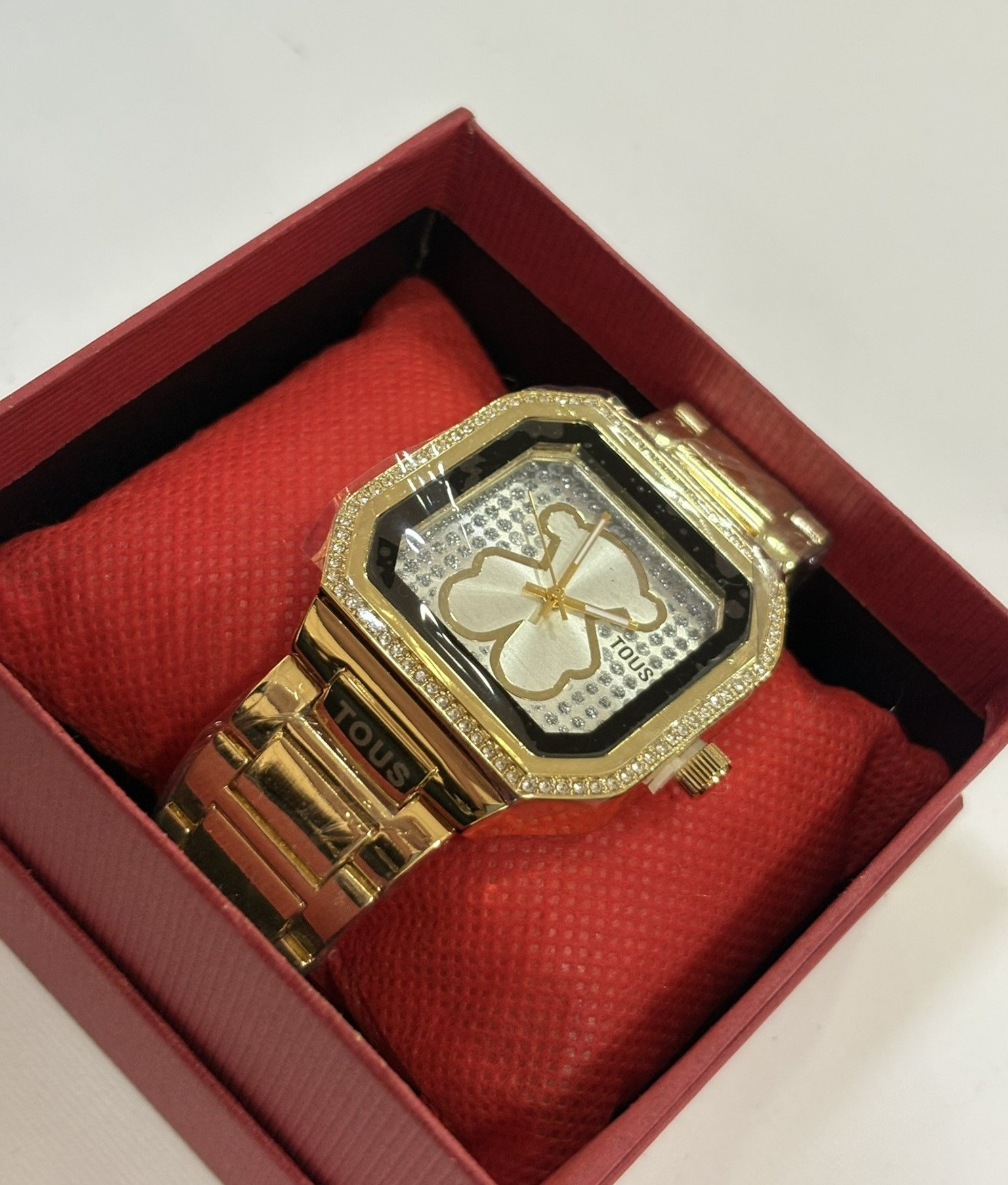 Reloj de acero inoxidable con acabado dorado y diseño sofisticado. Caja geométrica con bisel decorado con detalles brillantes y esfera con incrustaciones que realzan su elegancia. Correa metálica resistente y estilo exclusivo, ideal para destacar con un toque de lujo moderno.