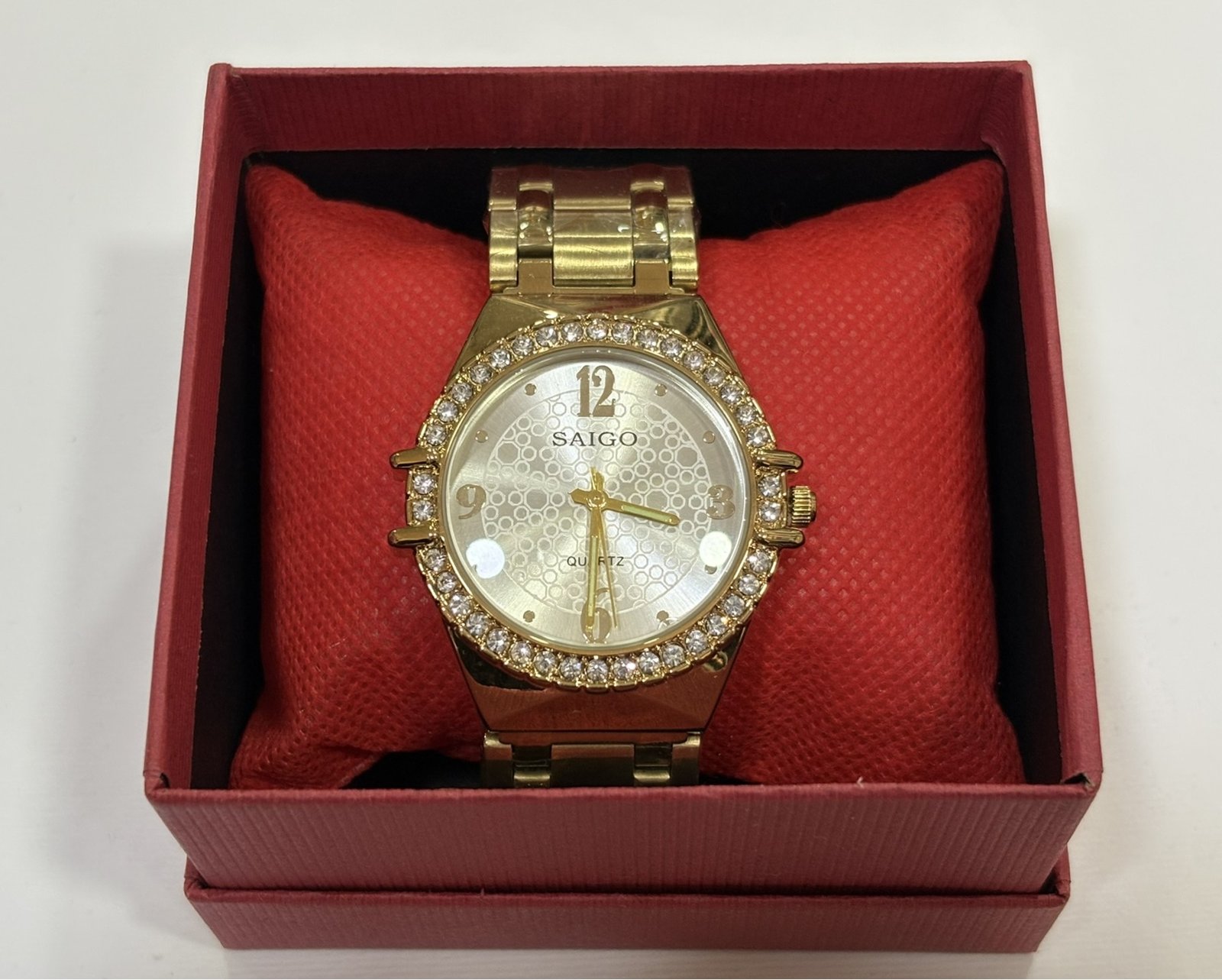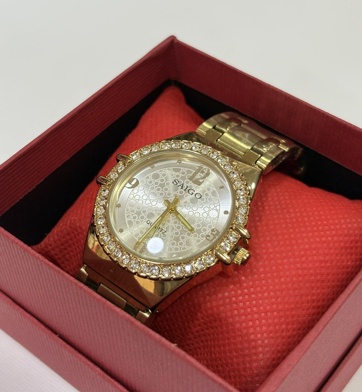 Reloj de acero inoxidable con acabado dorado y diseño elegante. Esfera con textura detallada, números clásicos y bisel con incrustaciones brillantes que realzan su estilo sofisticado. Movimiento quartz preciso y correa metálica resistente, perfecto para un look distinguido y atemporal.