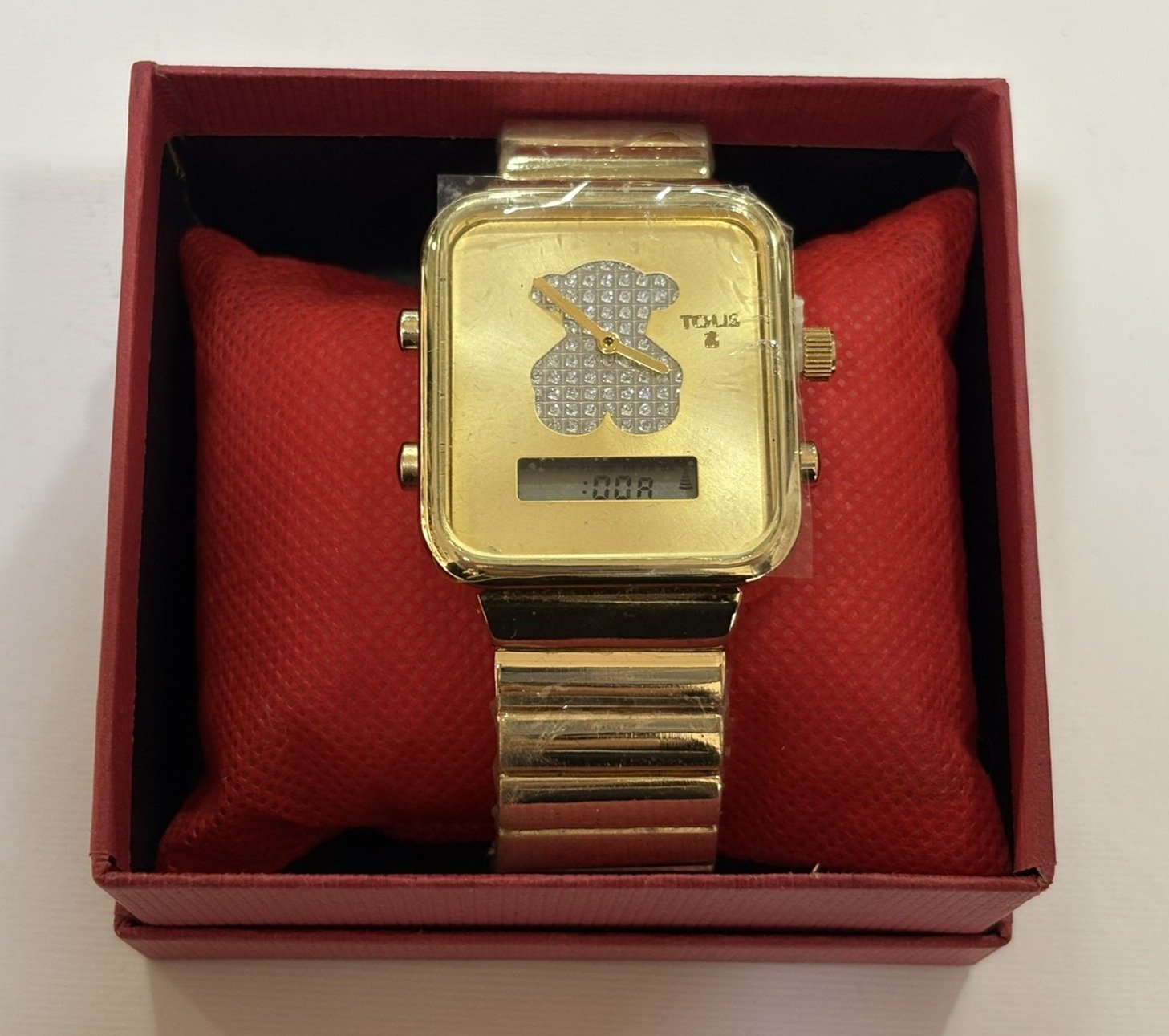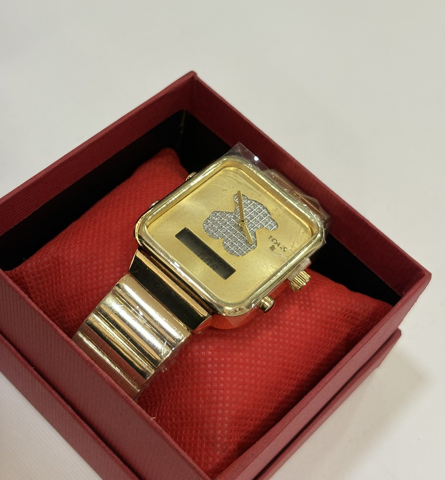 Reloj de acero inoxidable con acabado dorado y diseño elegante. Caja cuadrada que combina esfera analógica con pantalla digital, destacando el icónico detalle central con incrustaciones brillantes. Correa metálica resistente y estilo moderno, ideal para un look sofisticado y versátil.