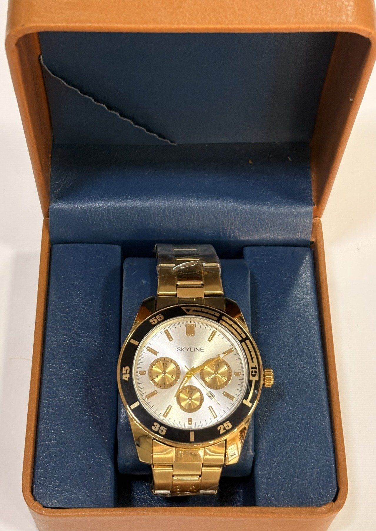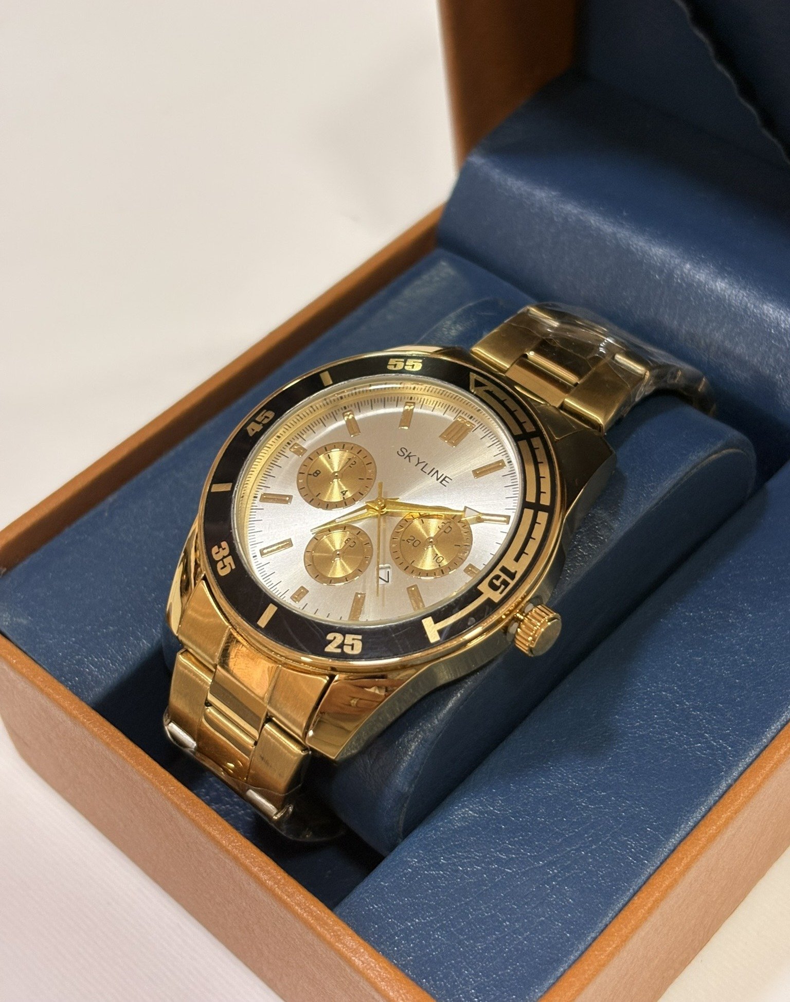 Reloj de acero inoxidable en tono dorado con bisel negro que aporta un contraste elegante y moderno. Esfera multifunción con detalles dorados que refuerzan su estilo sofisticado. Correa metálica resistente, ideal para un look exclusivo y con carácter.