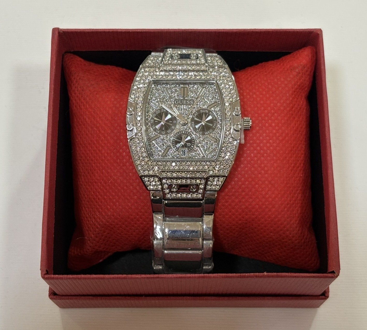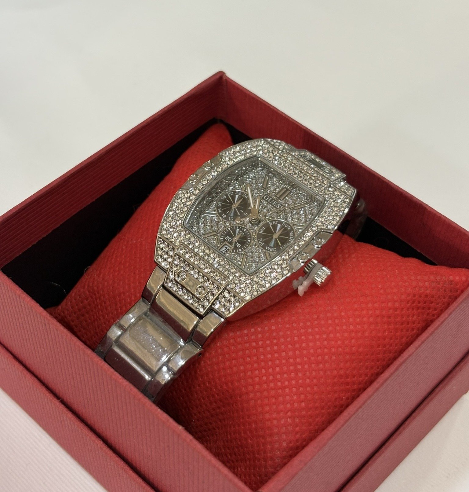 Reloj de acero inoxidable con acabado plateado y diseño de lujo. Caja y esfera completamente decoradas con incrustaciones brillantes que aportan un estilo sofisticado y llamativo. Multifunción con correa metálica resistente, ideal para un look exclusivo y elegante.