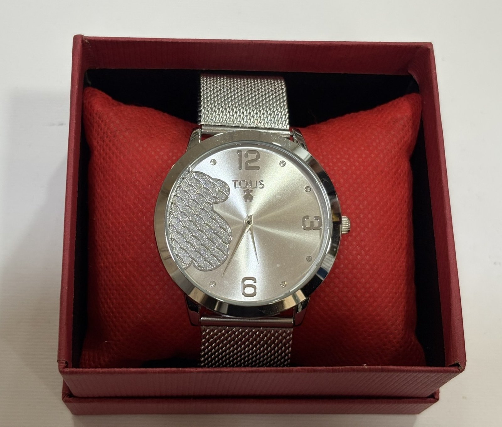 Reloj de acero inoxidable con acabado plateado y diseño elegante. Esfera minimalista con detalle decorativo y números sutiles que aportan sofisticación. Correa metálica tipo malla que ofrece comodidad y un estilo moderno y refinado.