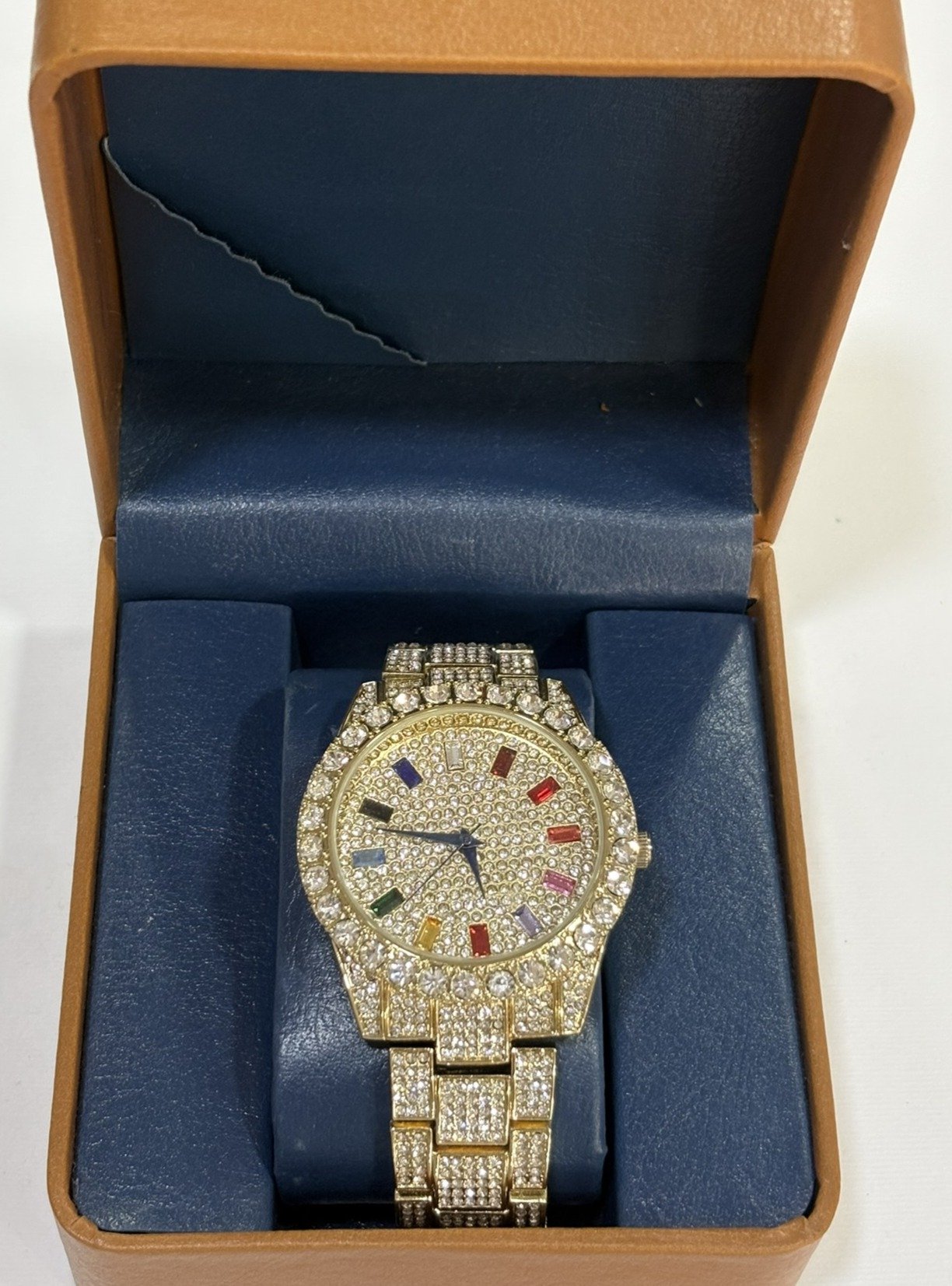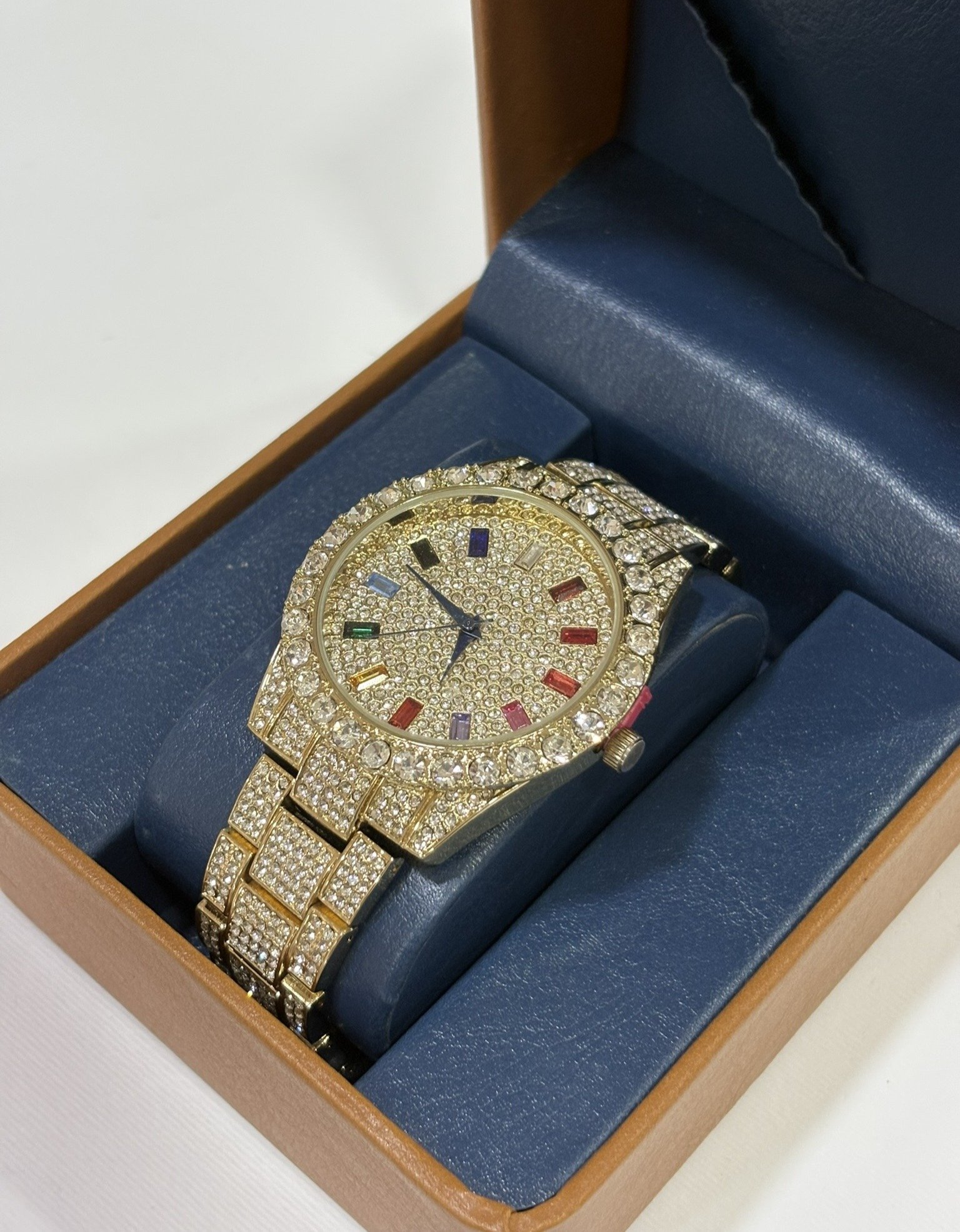 Reloj de acero inoxidable en acabado dorado con diseño completamente engastado en brillo, que aporta un estilo lujoso y llamativo. Esfera decorada con detalles multicolor que le dan un toque exclusivo y moderno, acompañado de una correa metálica a juego que refuerza su elegancia.