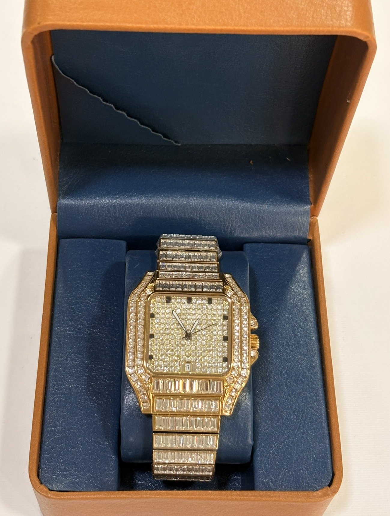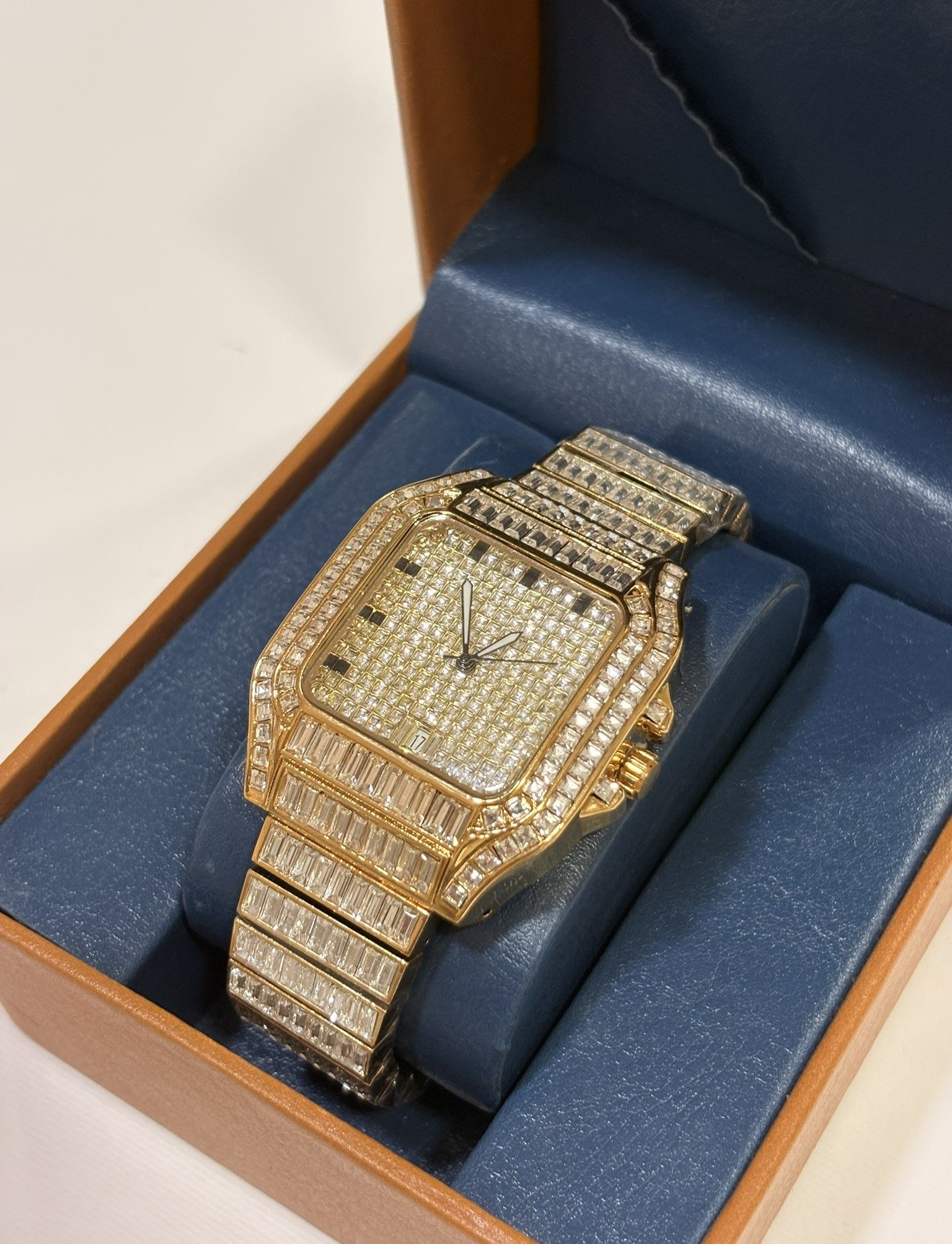Reloj de acero inoxidable en acabado dorado, completamente engastado con detalles brillantes que reflejan lujo en cada ángulo. Su esfera cuadrada con acabado premium y correa a juego lo convierten en una pieza exclusiva, elegante y pensada para destacar.