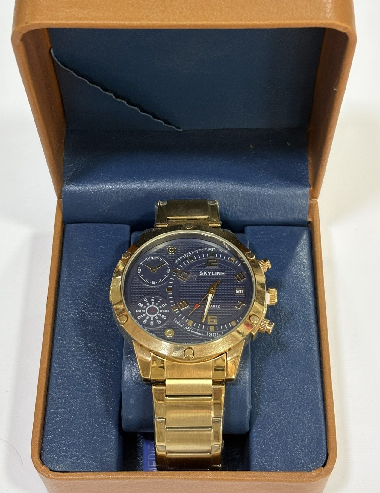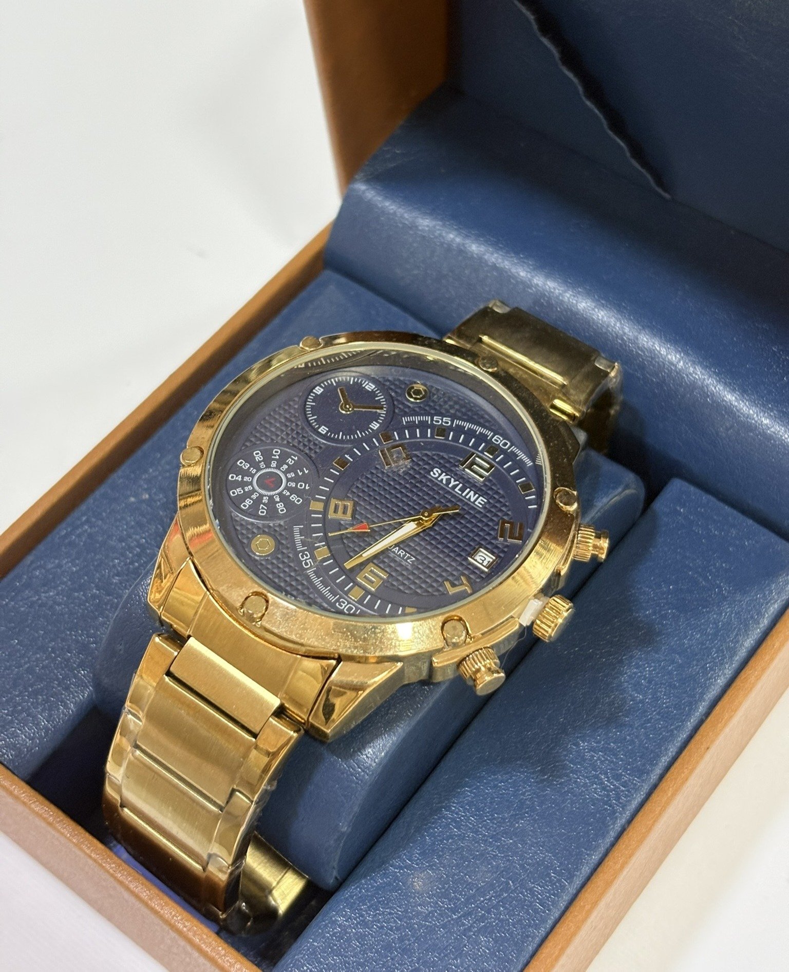 Reloj de acero inoxidable en acabado dorado con elegante esfera azul multifunción. Su diseño moderno y detalles en relieve aportan un estilo sofisticado y potente, ideal para destacar con distinción.